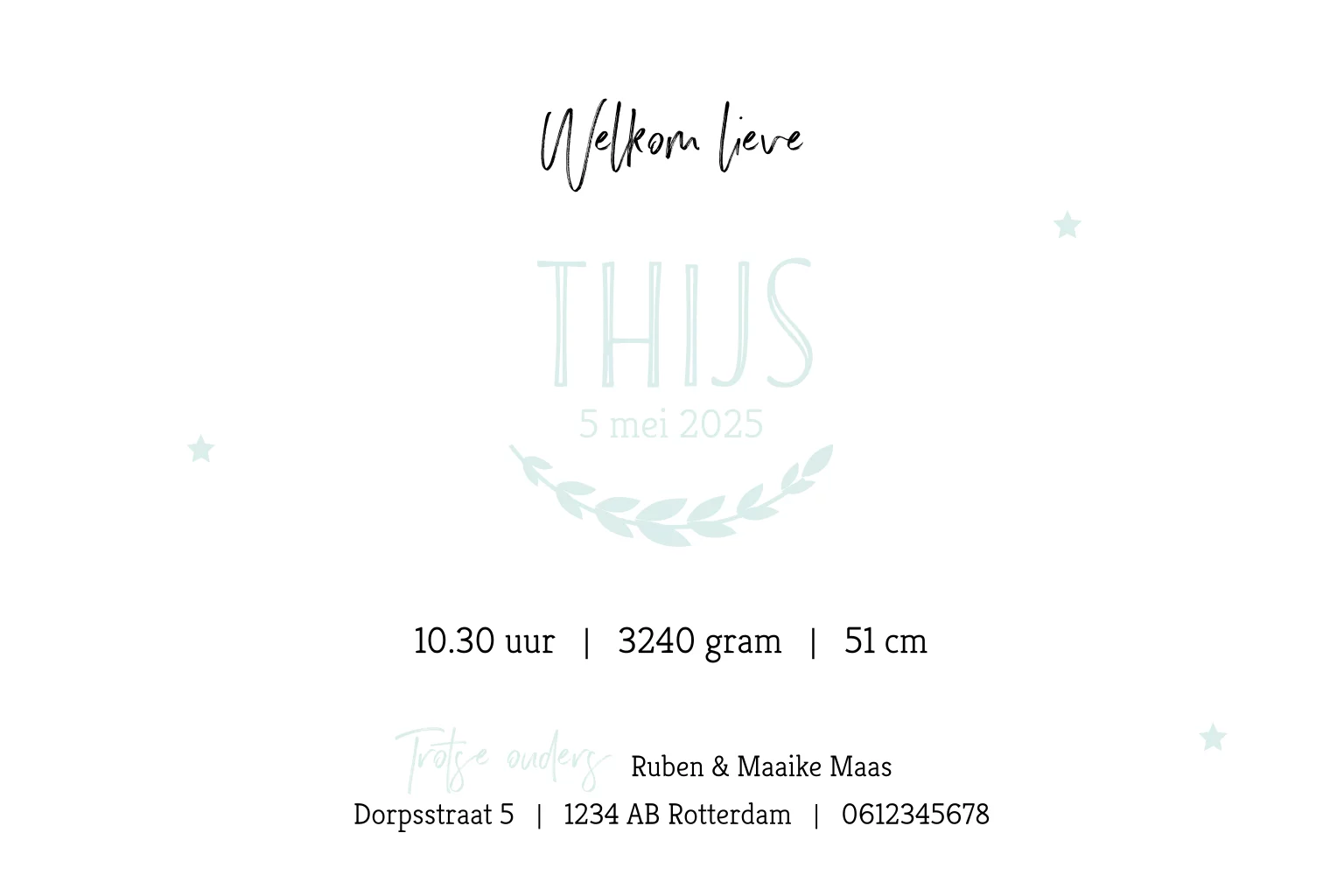 Hip geboortekaartje voor een jongen mint kleurig met sterretjes. De kleur kan gemakkelijk worden aanpast naar een andere kleur, zo creëer je weer een heel ander kaartje.