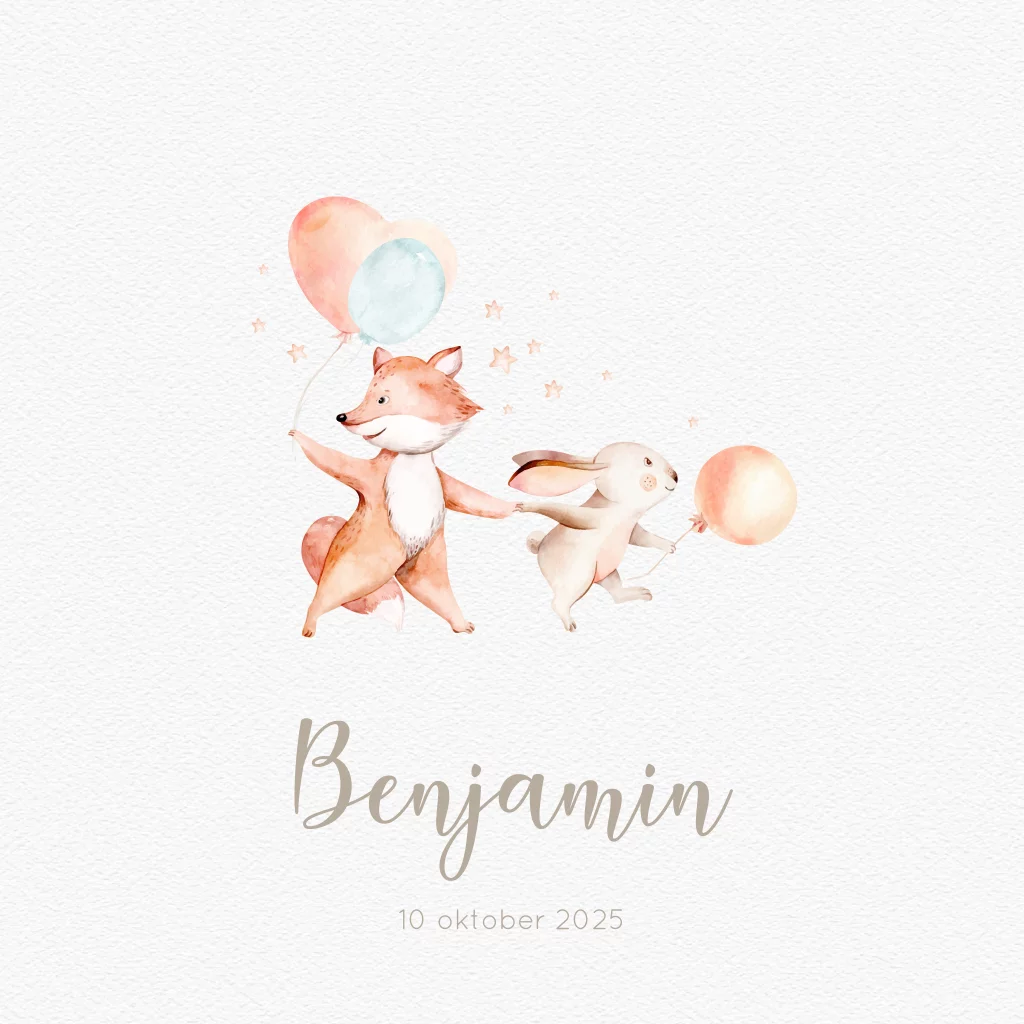 Lief geboortekaartje met tekening vosje en konijn.