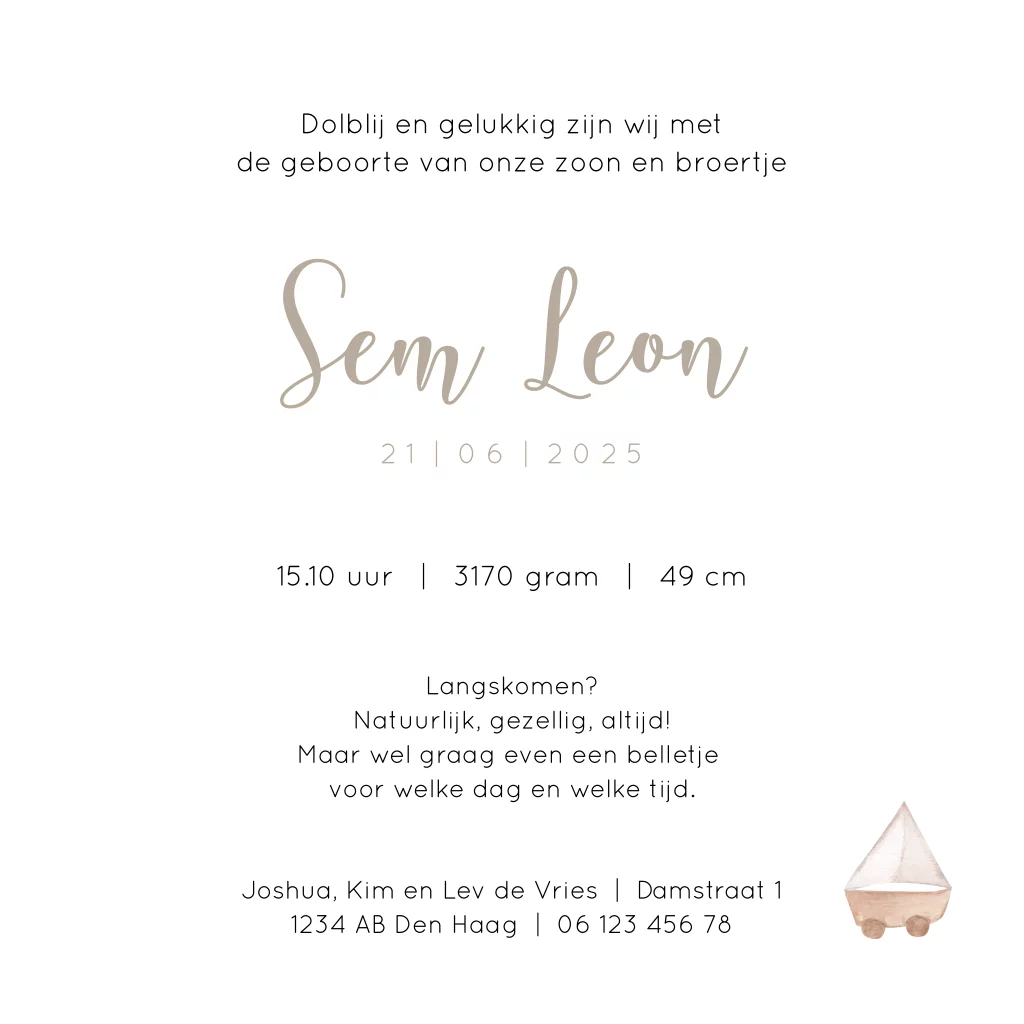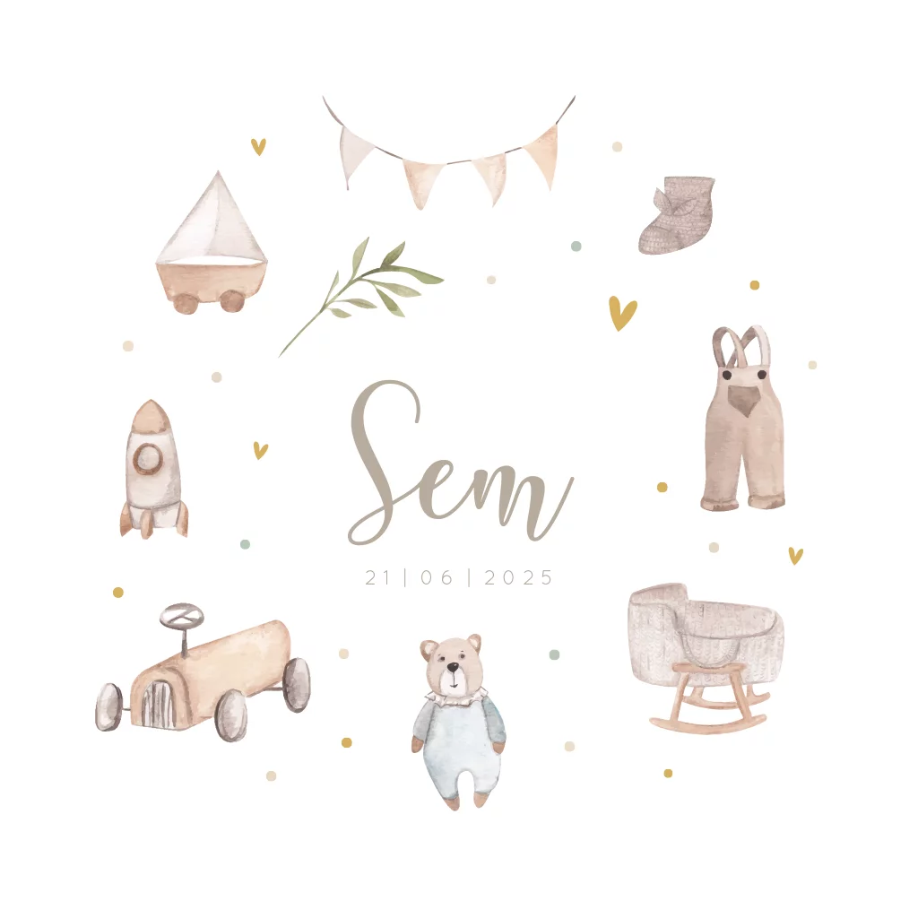 Schattig geboortekaartje met tekeningen voor een jongen.