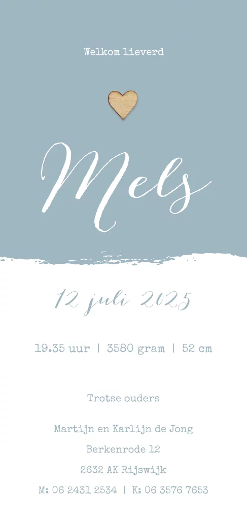 Trendy geboortekaartje met bij te bestellen echt houten hartje