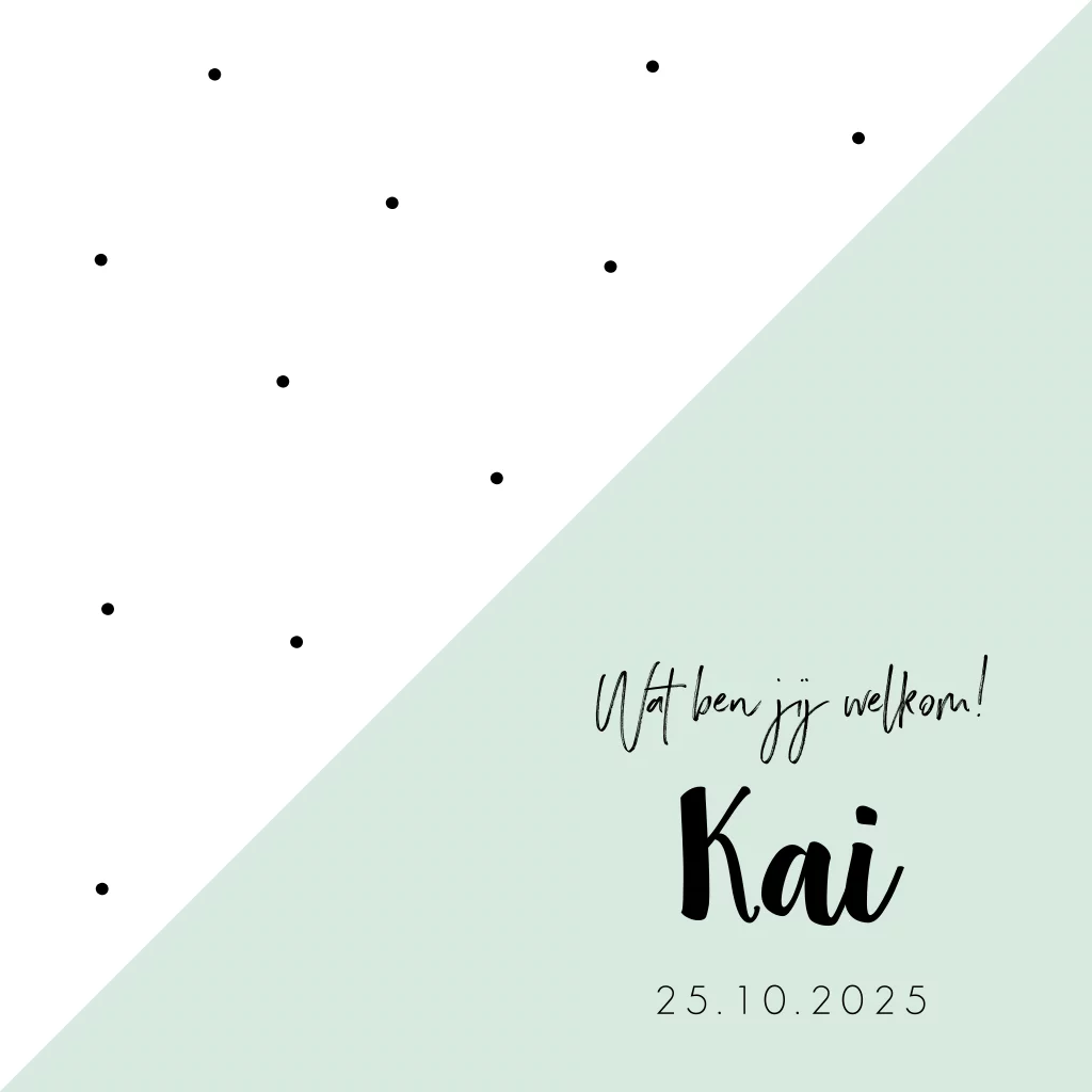 Geboortekaartje mint voor een jongen met diagonaal en stipjes. De kleuren van dit kaartje zijn ook gemakkelijk aan te passen en zo creëer je weer een heel ander geboortekaartje.
