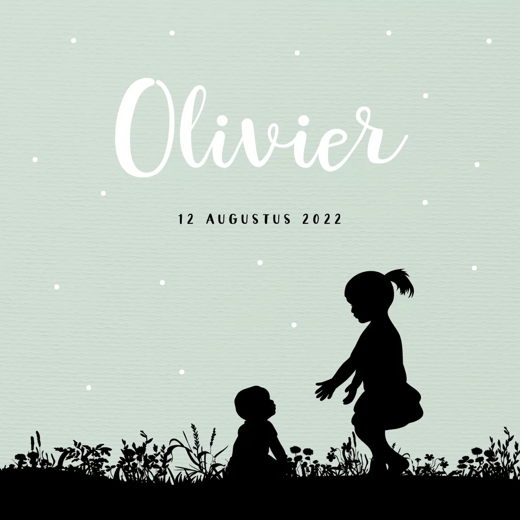 Hip zacht groen geboortekaartje voor een jongen met silhouet van een grote zus met haar kleine broertje.