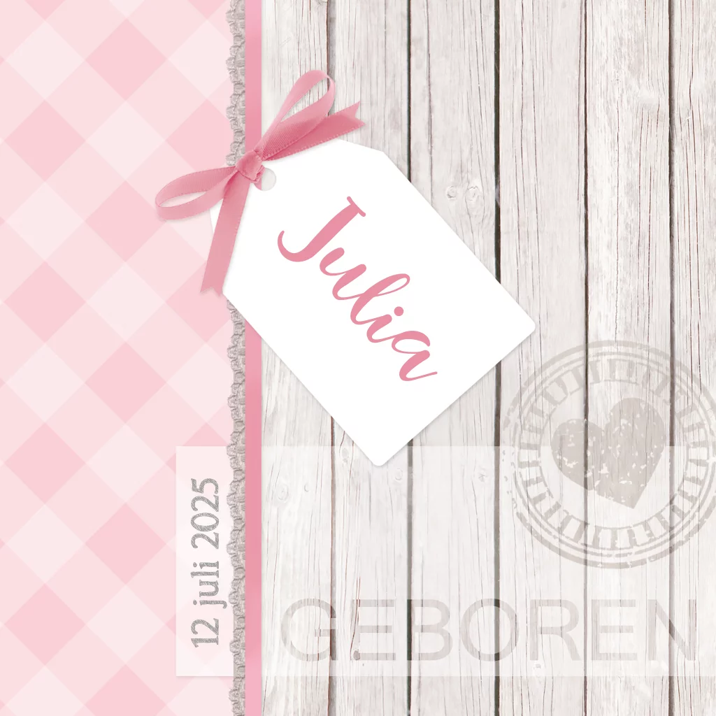 Geboortekaartje met steigerhout, ruitjespatroon, strikje en label.