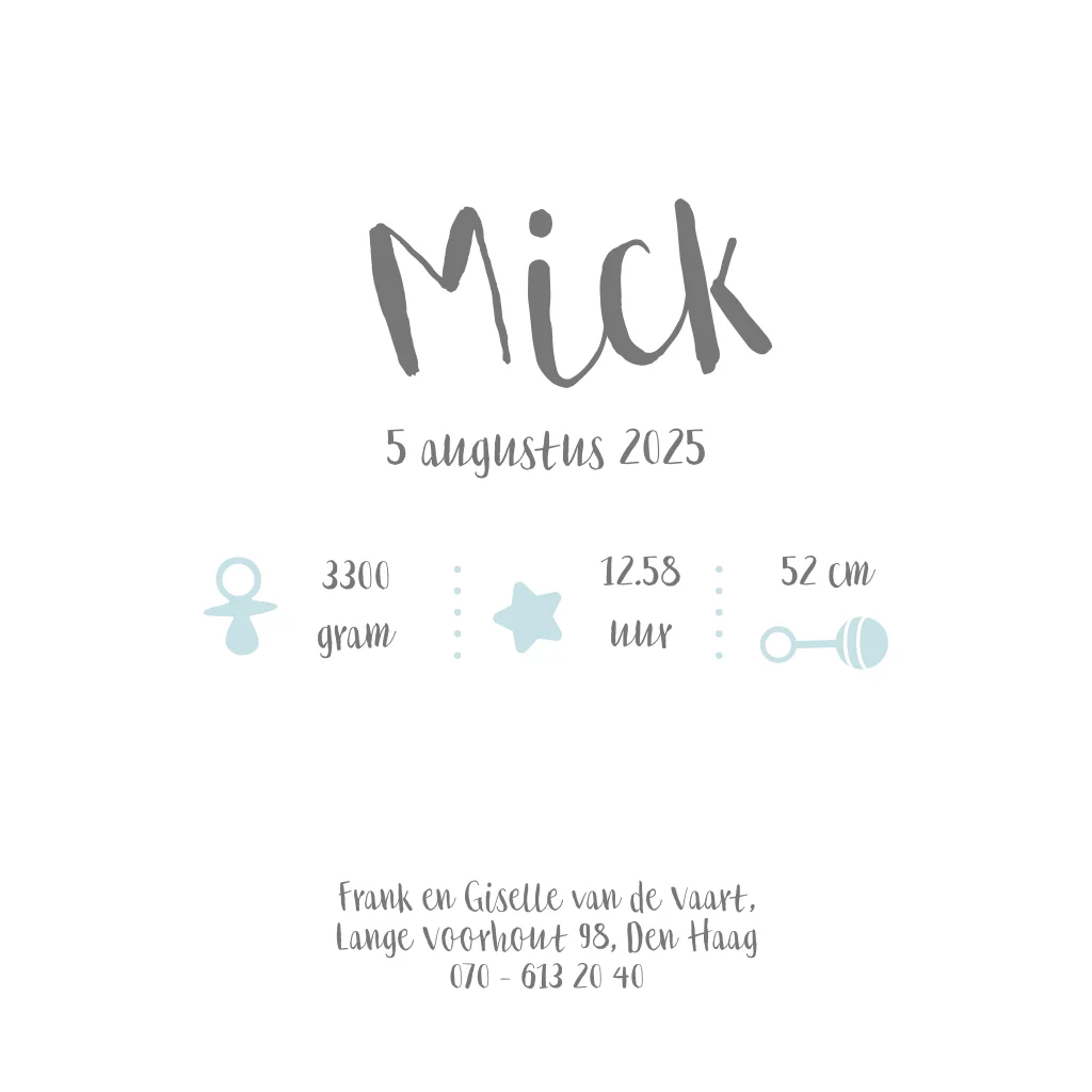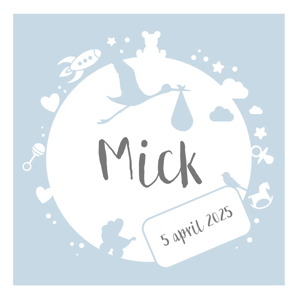 Lief geboortekaartje met icoontjes in het blauw voor een jongen. De kleur blauw is aan te passen.