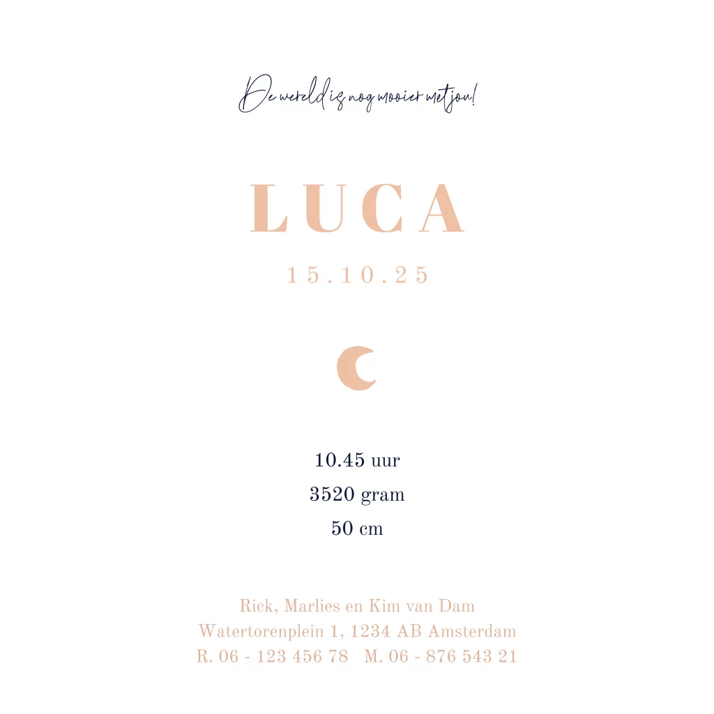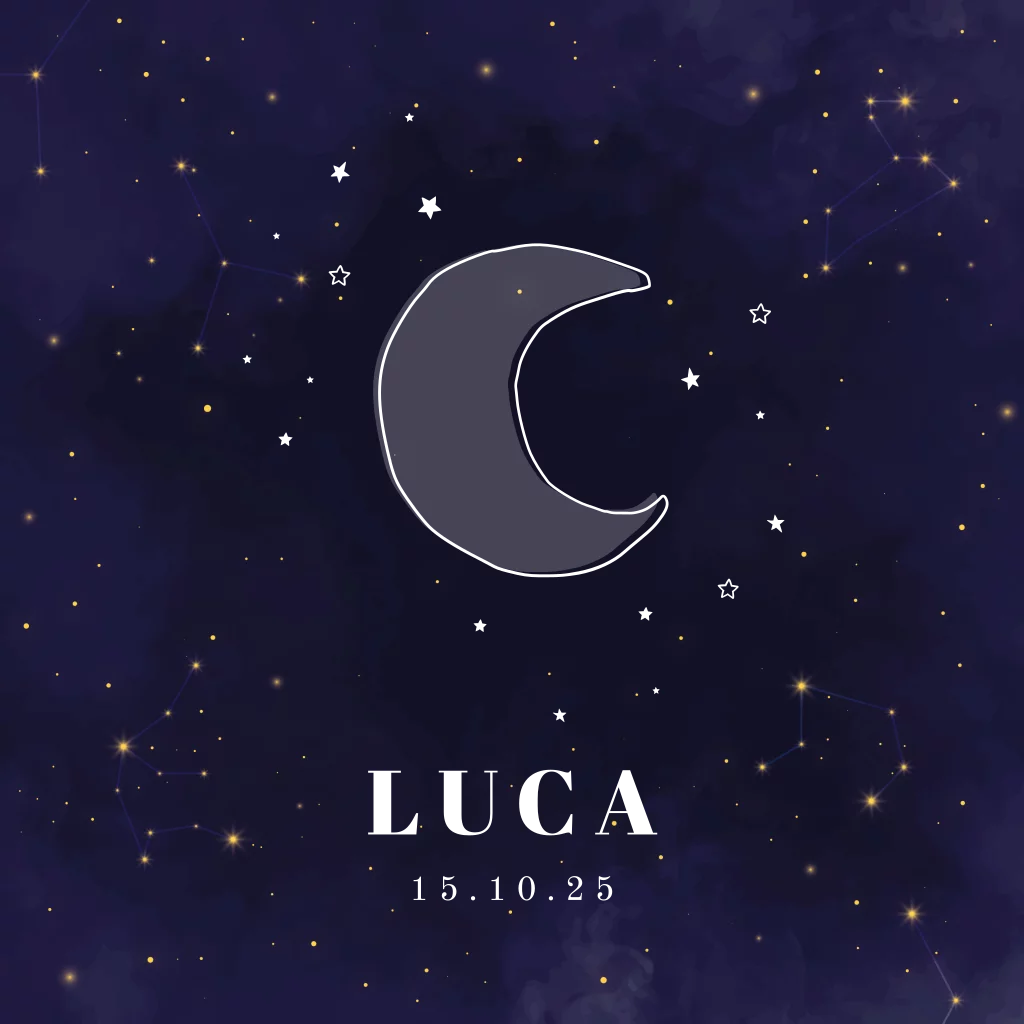 Hip geboortekaartje donkerblauw met maan en sterren in folie. Let op: Deze kaart heeft een langere verzendtijd: voor 18.00 uur besteld = de volgende werkdag gedrukt en verzonden. Minimale bestelhoeveelheid: 5 stuks.