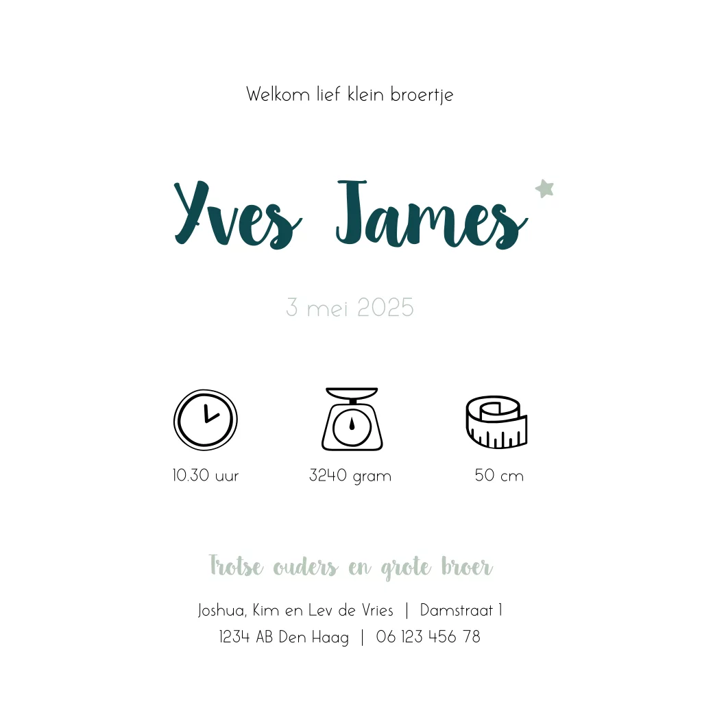 Groen geboortekaartje met silhouet van boom met grote broer en baby. Personaliseer de kaart zelf met de afbeeldingen naar jouw eigen gezinssituatie. Andere silhouetjes zijn te vinden in de afbeeldingen bibliotheek in de editor. Minimale bestelhoeveelheid is: 5 stuks.