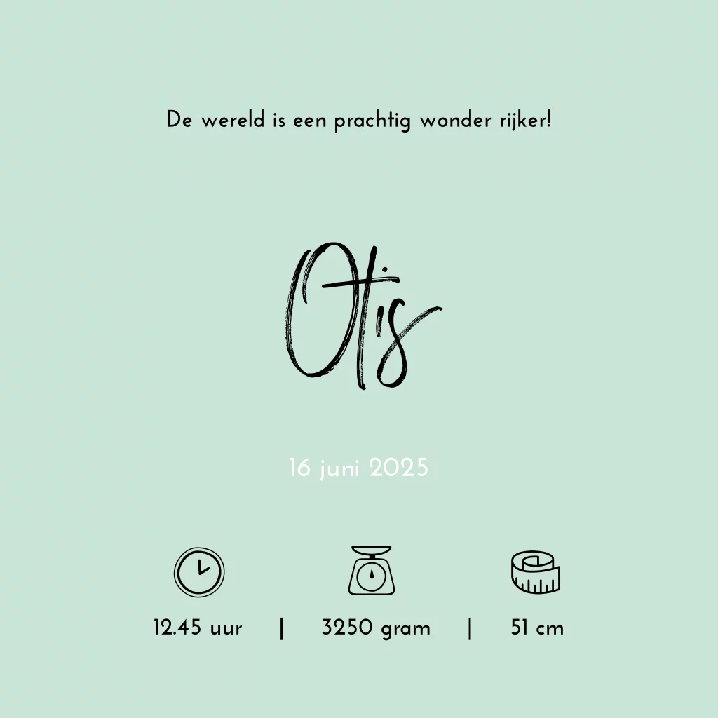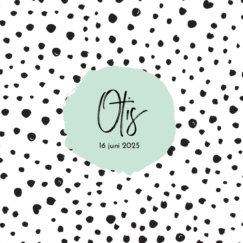 Hip geboortekaartje voor een jongen met zwarte stippen. Deze combineren mooi met het mint kleurige rondje waarin de naam staat. Deze kan je ook gemakkelijk van kleur veranderen en zo creëer je weer een heel ander geboortekaartje.