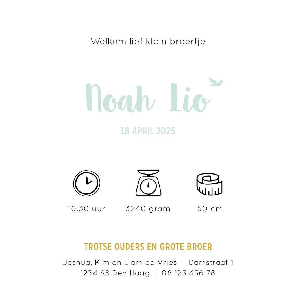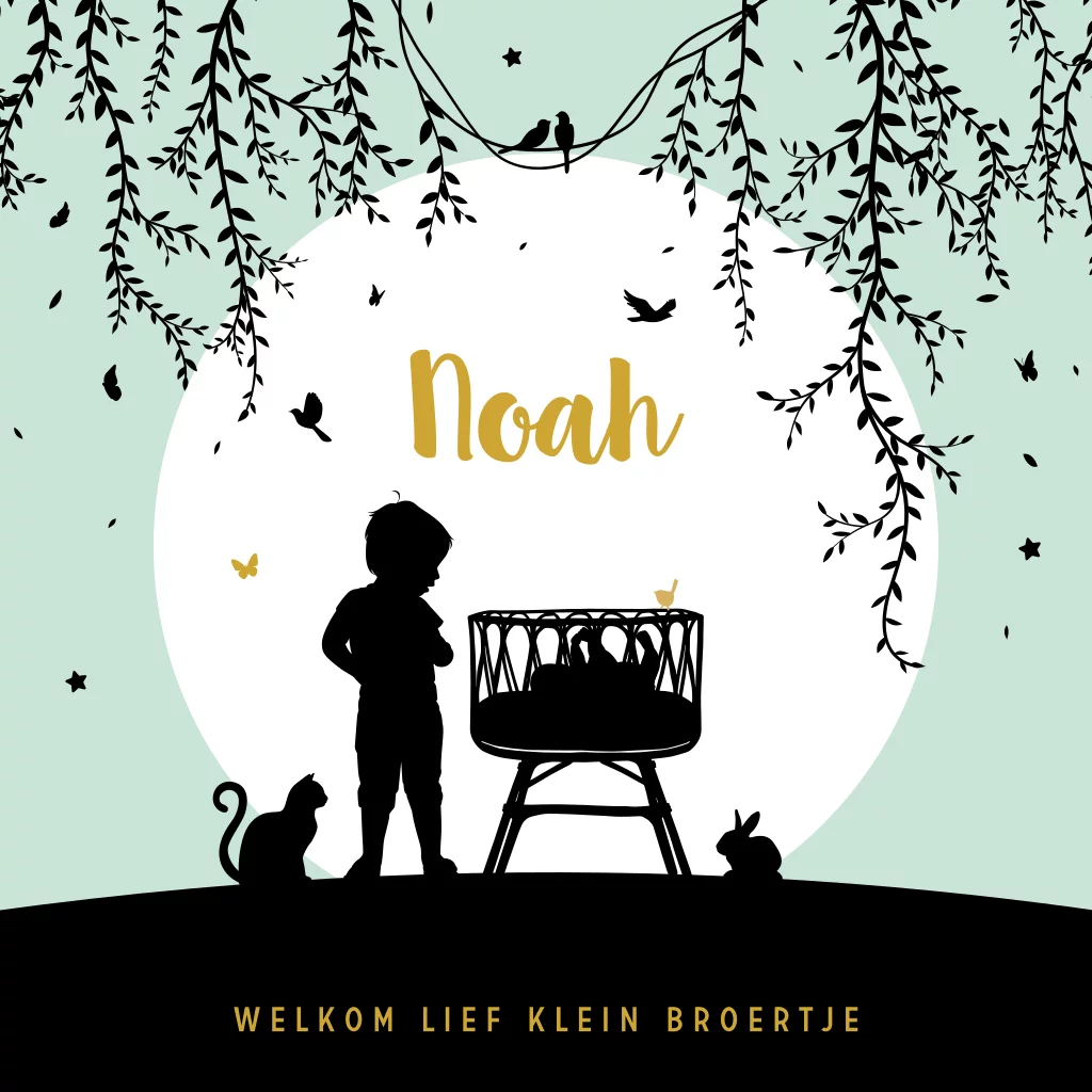 Hip geboortekaartje voor een jongen met silhouet van grote broer, wieg en takjes. Personaliseer de kaart zelf met de afbeeldingen naar jouw eigen gezinssituatie. Andere silhouetjes zijn te vinden in de afbeeldingen bibliotheek in de editor. Minimale bestelhoeveelheid is: 5 stuks.