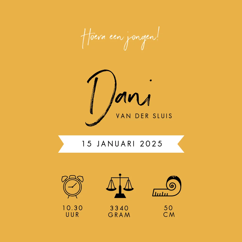 Hip geboortekaartje oker geel jongen met stipjes rand