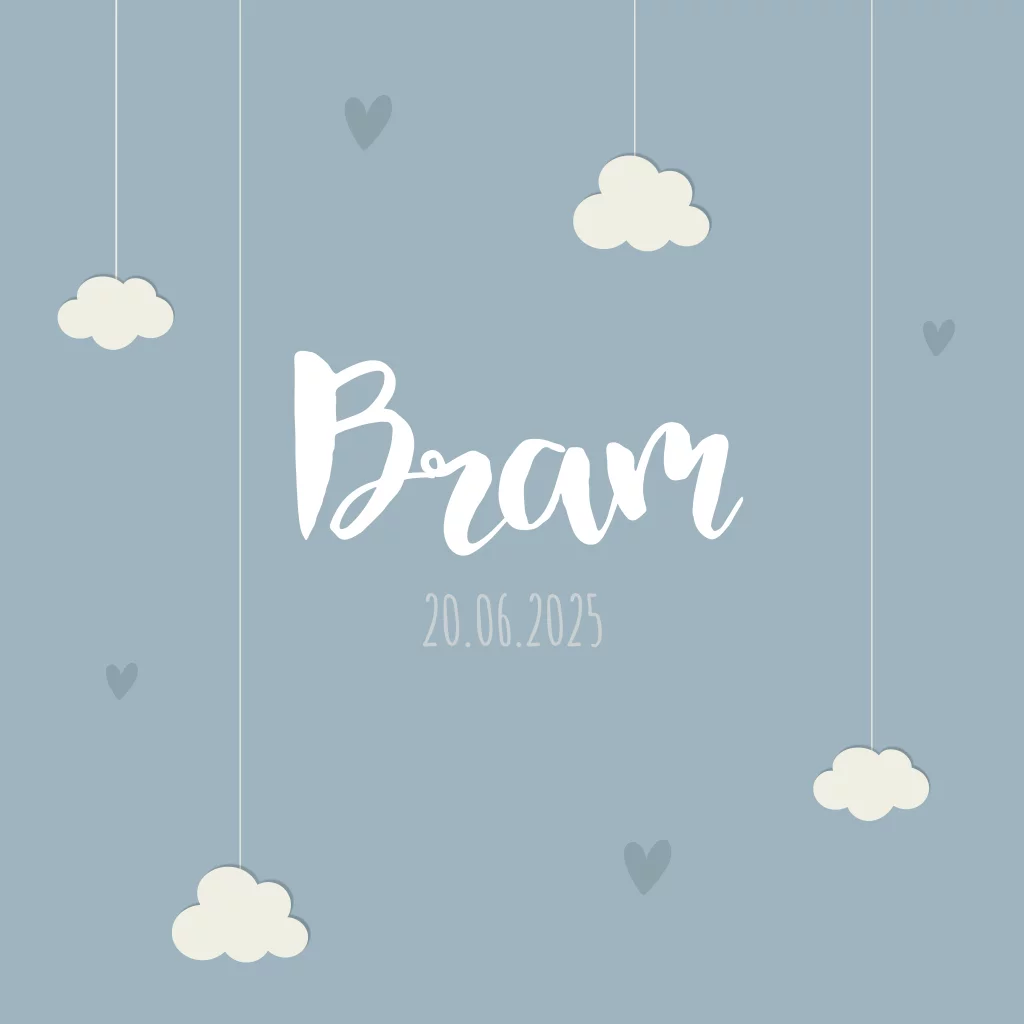Lief geboortekaartje voor een jongen met wolkjes en hartjes. De kleuren zijn geheel naar eigen wens om te zetten.