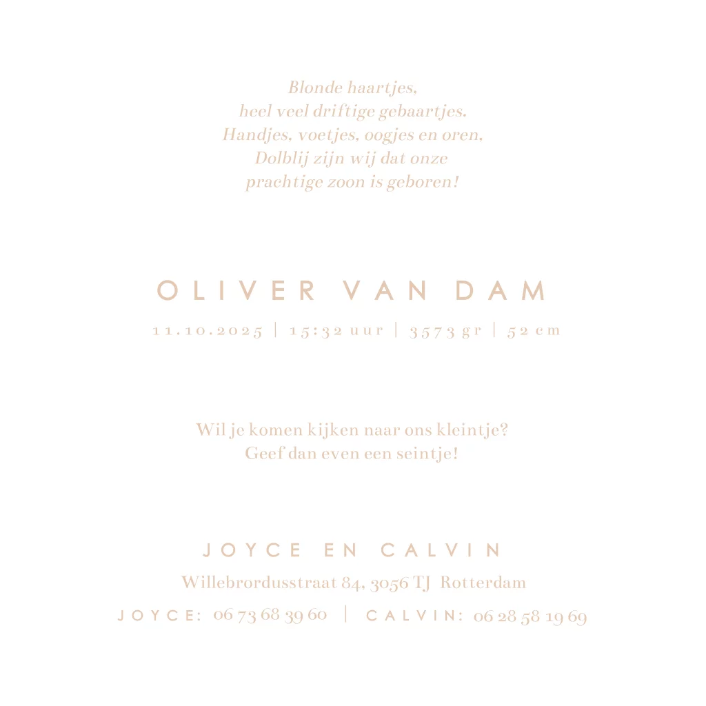 Dit lieve geboortekaartje kan voorzien worden van een foto op de voorkant, met tekst "Een zoon" over de foto heen.