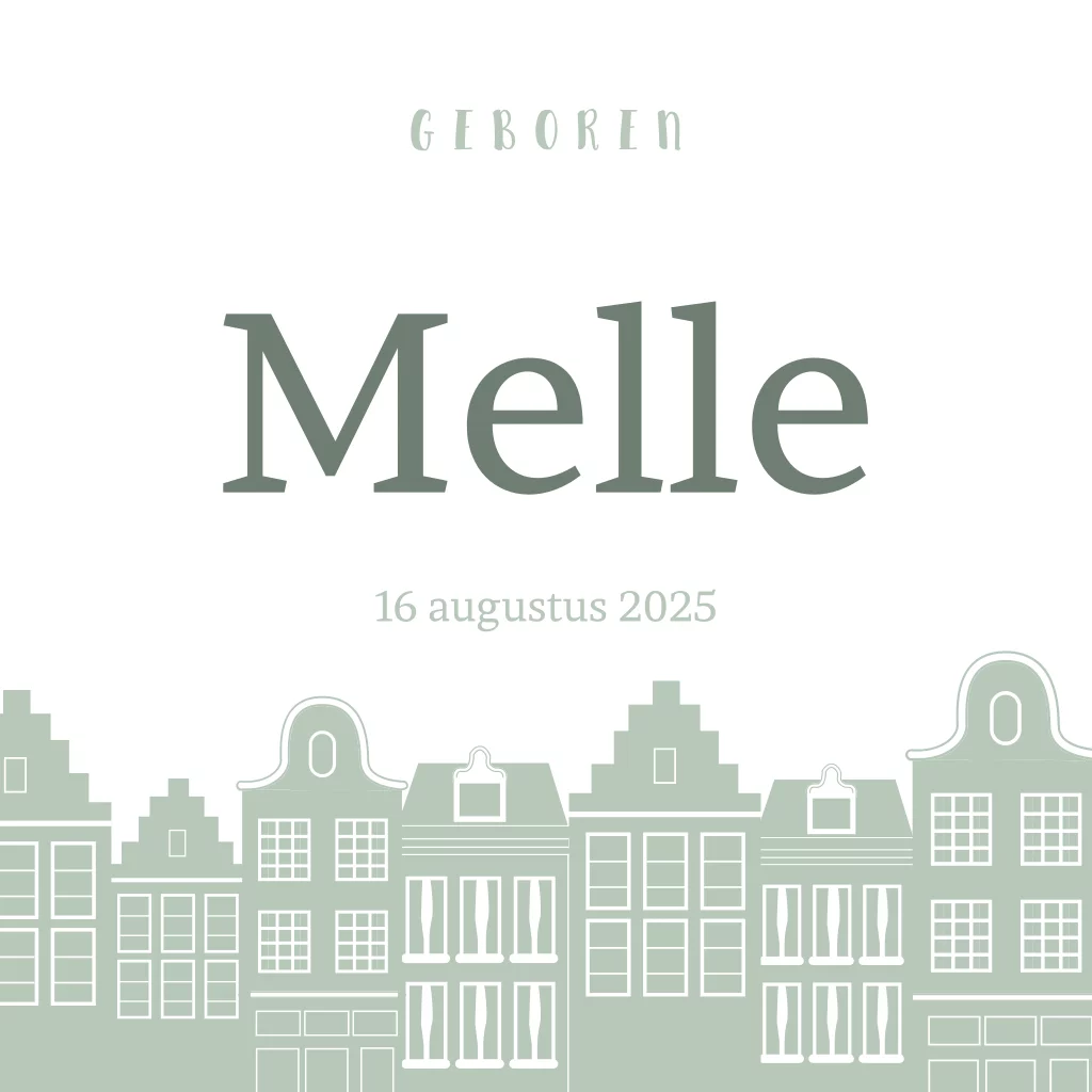 Stoer geboortekaartje jongen met grachtenpandjes groen. Je kan eenvoudig de naam + geboortedatum aanpassen naar jullie wens. Leuk om te weten: je kan in de editor de kleuren aanpassen, zo wordt het een compleet ander kaartje! Kom je er even niet uit? Neem dan contact met ons op.