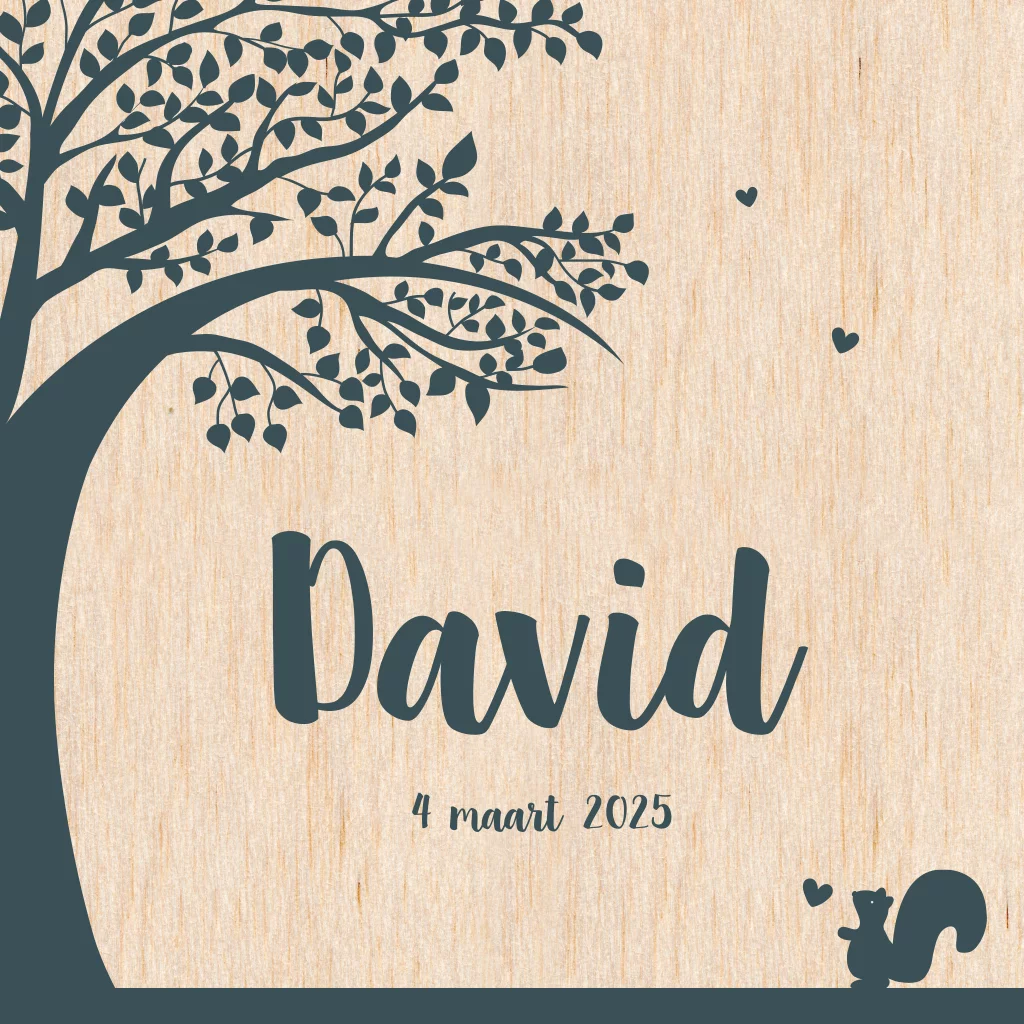 Stoer geboortekaartje van echt hout voor een jongen. Dit unieke kaartje wordt gedrukt op écht berkenhout.
