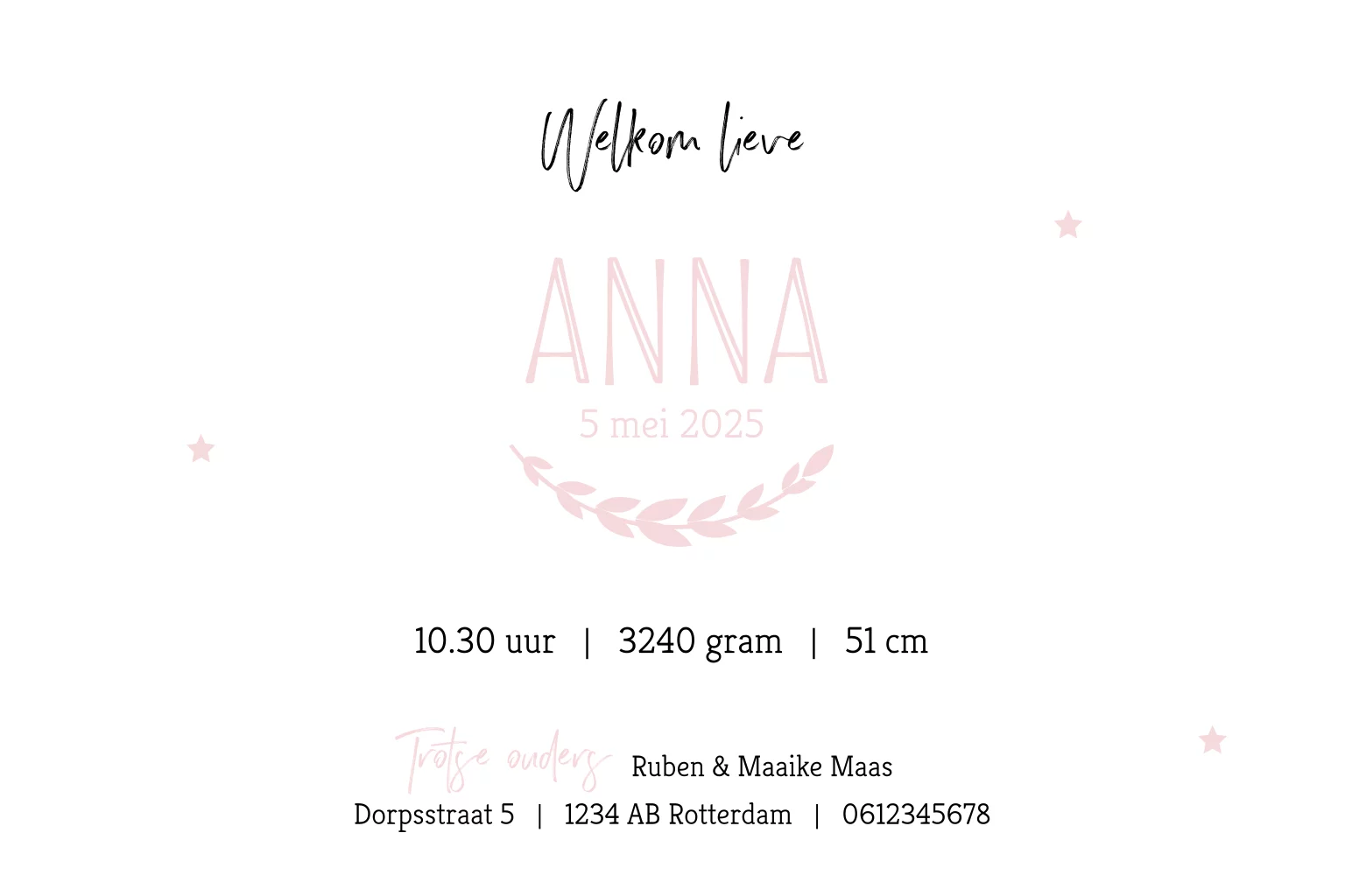 Hip geboortekaartje voor een meisje roze met sterretjes. De kleur kan gemakkelijk worden aanpast naar een andere kleur, zo creëer je weer een heel ander kaartje.