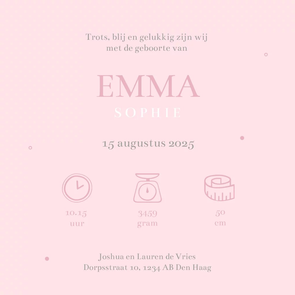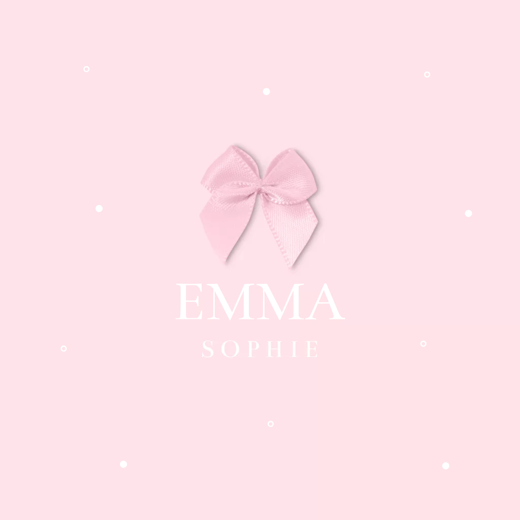 Lief geboortekaartje voor een meisje met echt roze strikje en folie naam en stipjes. Het strikje wordt niet afgedrukt op de kaart maar is los bij te bestellen. Het afgebeelde kaartje is opgemaakt op het formaat 11x11cm. Het afgebeelde strikje is op dit formaat 1:1 weergegeven. Het strikje is voorzien van een plakkertje en zo dus gemakkelijk te bevestigen. Tevens zijn de kleuren van dit kaartje gemakkelijk aan te passen en zo creëer je weer een heel ander geboortekaartje! Let op: Deze kaart heeft een langere verzendtijd: voor 18.00 uur besteld = de volgende werkdag gedrukt en verzonden. Minimale bestelhoeveelheid: 5 stuks.