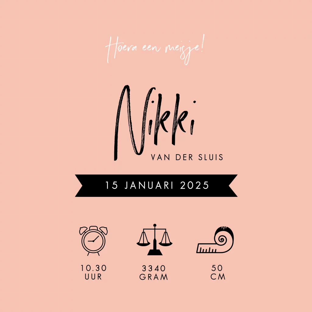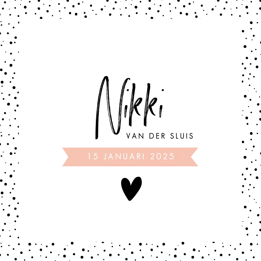 Hip geboortekaartje voor een meisje met een rand van zwarte stipjes. Het vaantje en de achtergrond zijn tevens naar alle kleuren om te kleuren, zodat het kaartje altijd het kleuraccent heeft die bij je past.
