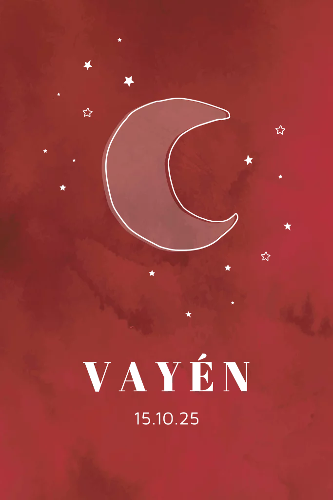 Hip geboortekaartje terracotta met maan en sterren in folie. Let op: Deze kaart heeft een langere verzendtijd: voor 18.00 uur besteld = de volgende werkdag gedrukt en verzonden. Minimale bestelhoeveelheid: 5 stuks.