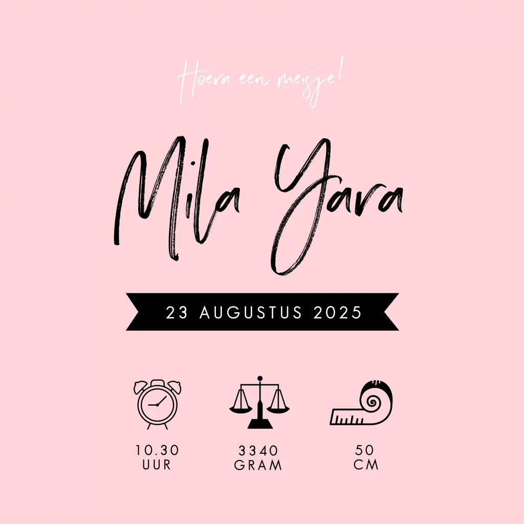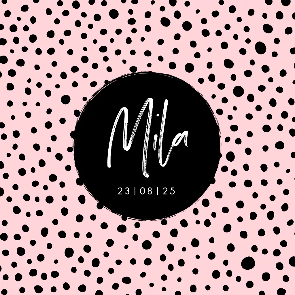 Hip roze geboortekaartje voor een meisje met zwarte stippen. Je kunt gemakkelijk de kleuren van de kaart veranderen en zo creëer je weer een heel ander geboortekaartje.