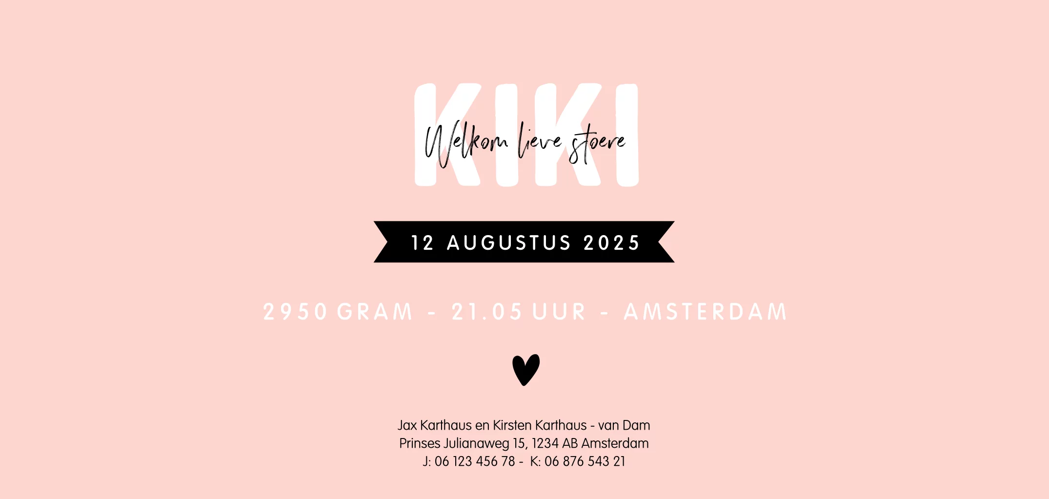 Hip en stoer geboortekaartje voor een meisje met zwart stipjes. De kleuren van dit kaartje zijn ook gemakkelijk aan te passen en zo creëer je weer een heel ander geboortekaartje!