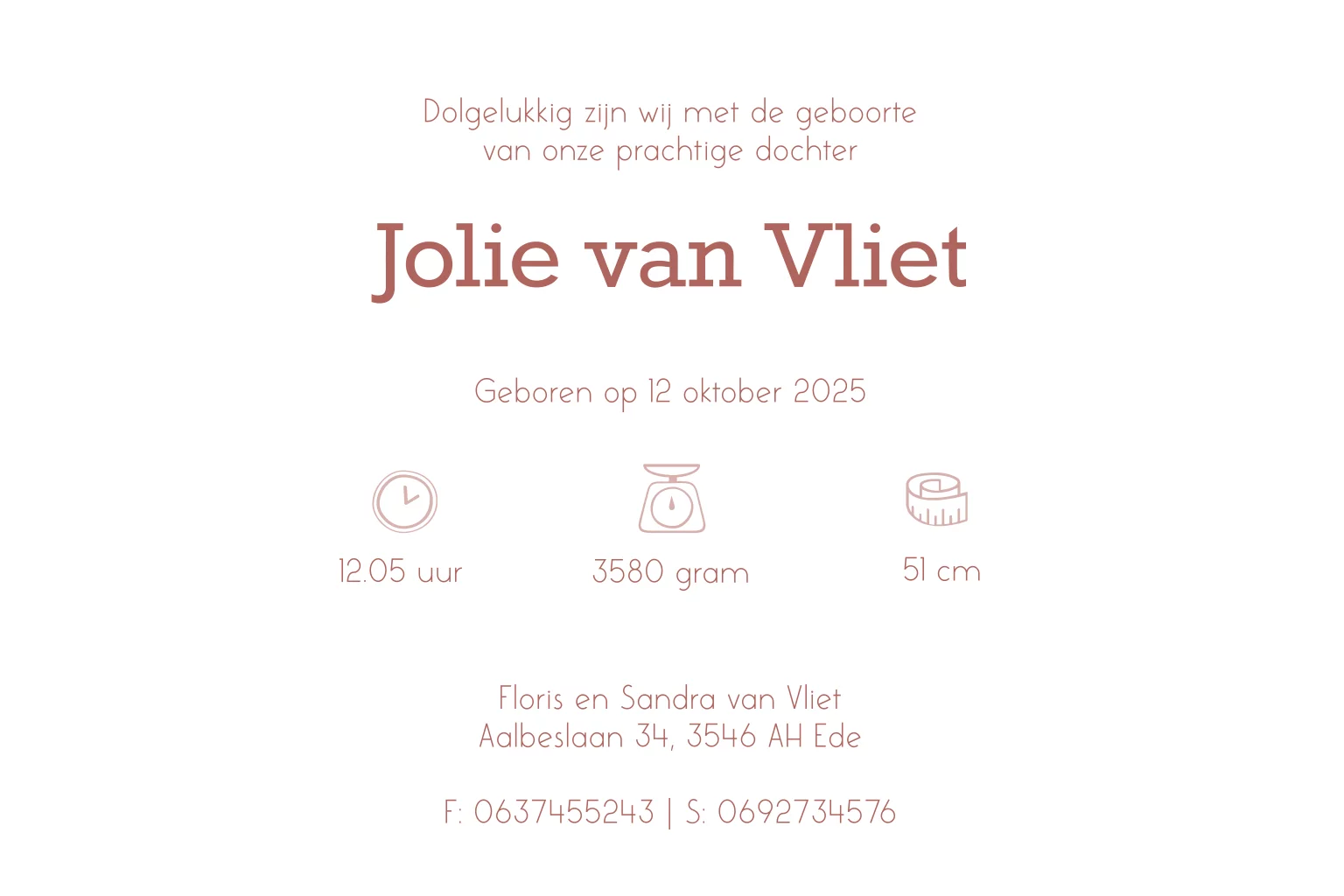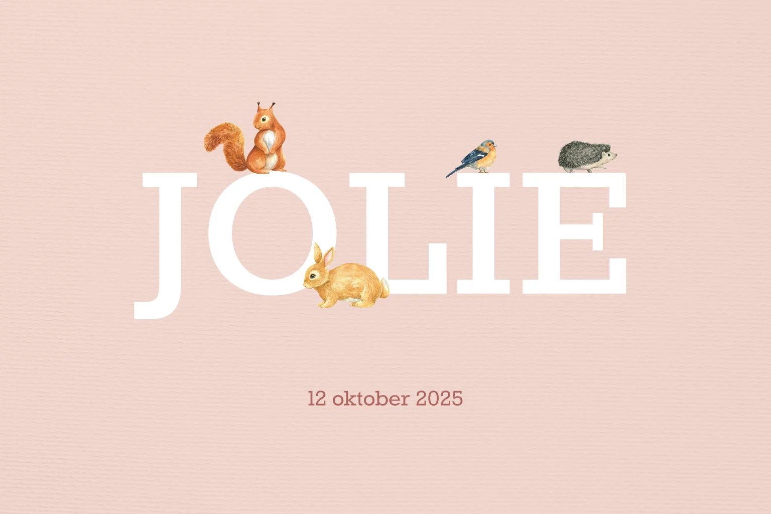 Lief geboortekaartje met bosdiertjes. Verander de naam en plaats de diertjes eenvoudig op de juiste plek in de editor.
