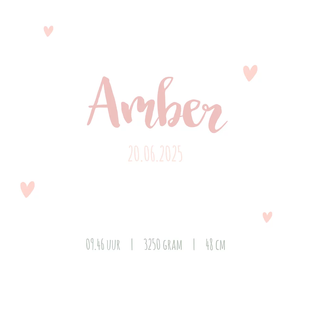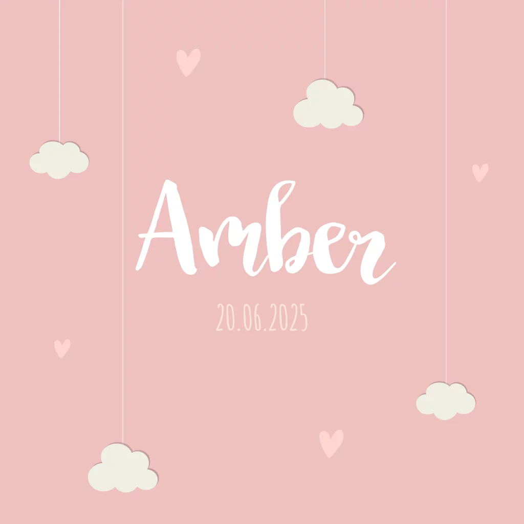 Lief geboortekaartje voor een meisje met wolkjes en hartjes. De kleuren zijn geheel naar eigen wens om te zetten.