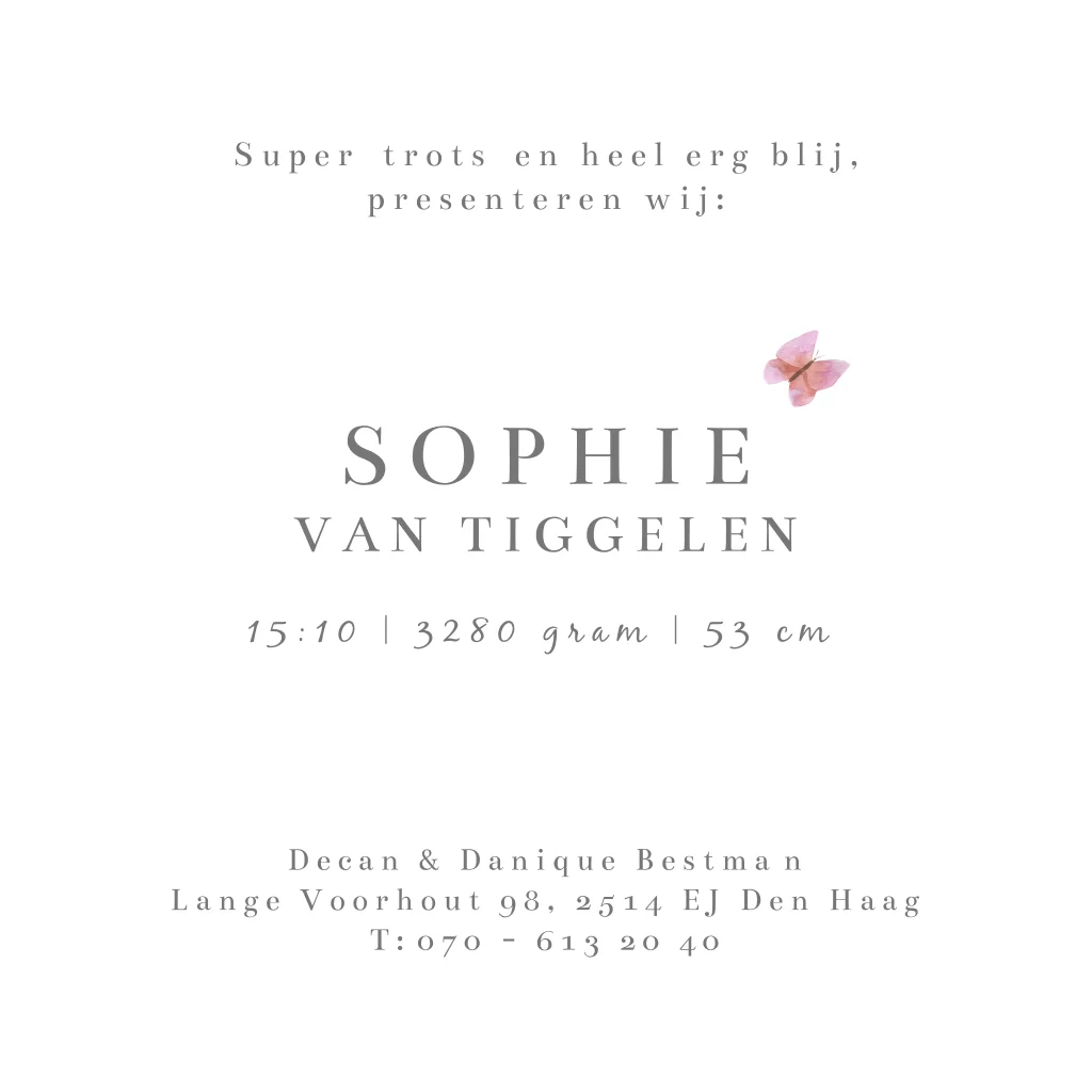 Lief geboortekaartje met krans, vlinders en bloemen op aquarelpapier. De grootte en de positie van de krans is naar wens aan te passen.