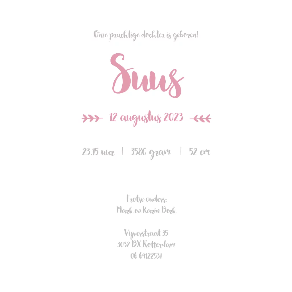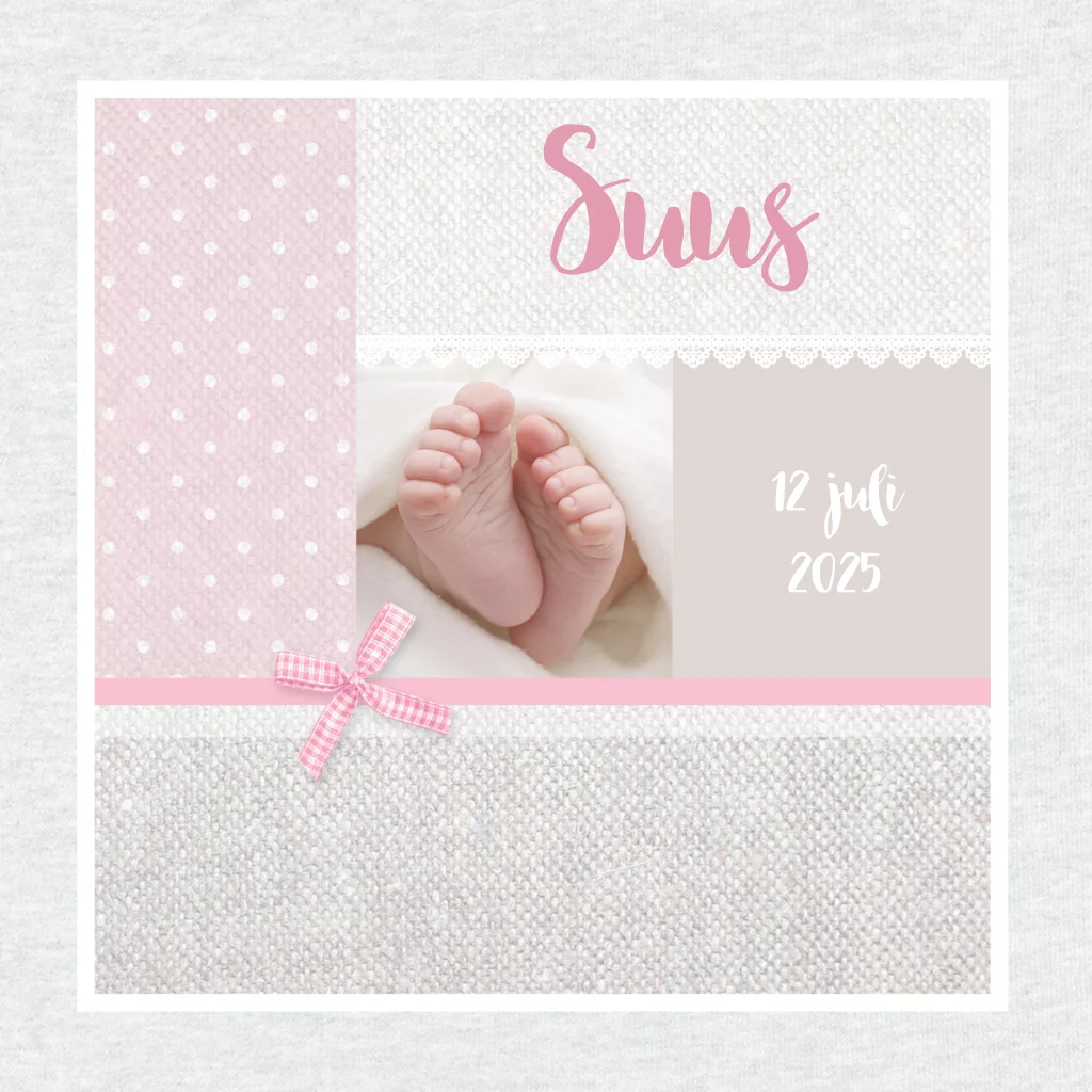Lief geboortekaartje met voetjes en strikje. Dit kaartje is ook te vinden in de jongenscollectie. In de editor kan je zelf de naam en tekst aanpassen. Daarnaast kan je al een proefdruk bestellen vanaf €1,-.