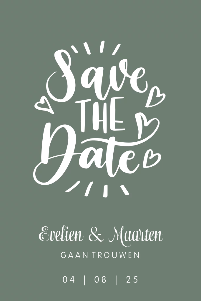Groene save the date kaart met folie. De kleuren van deze kaart zijn gemakkelijk aan te passen en zo creëer je weer een heel ander kaartje. Let op: Deze kaart heeft een langere verzendtijd: voor 18.00 uur besteld = de volgende werkdag gedrukt en verzonden. Minimale bestelhoeveelheid: 5 stuks.