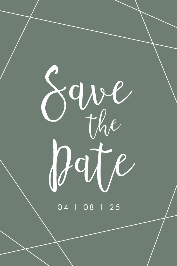 Groene save the date kaart grafisch met folie lijnen. Let op: Deze kaart heeft een langere verzendtijd: voor 18.00 uur besteld = de volgende werkdag gedrukt en verzonden. Minimale bestelhoeveelheid: 5 stuks.