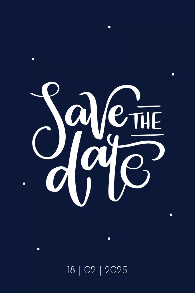 Save the date kaart donkerblauw met folie. Let op: Deze kaart heeft een langere verzendtijd: voor 18.00 uur besteld = de volgende werkdag gedrukt en verzonden. Minimale bestelhoeveelheid: 5 stuks.