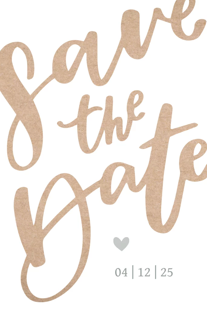 Trendy save the date kaart met kraft tekst. Voor dit ontwerp adviseren wij Oud-Hollands papier.