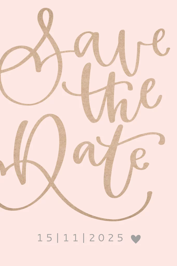 Trendy trouwkaart met kraftkleur en zalmroze. De roze tint is eenvoudig aan te passen naar wit of een kleur naar keuze.