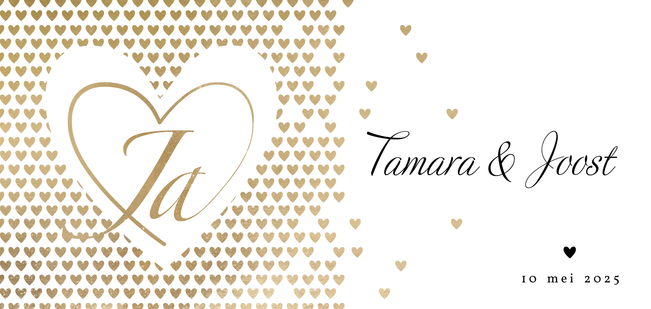 Trendy enkele trouwkaart met hartjes in goudkleur.