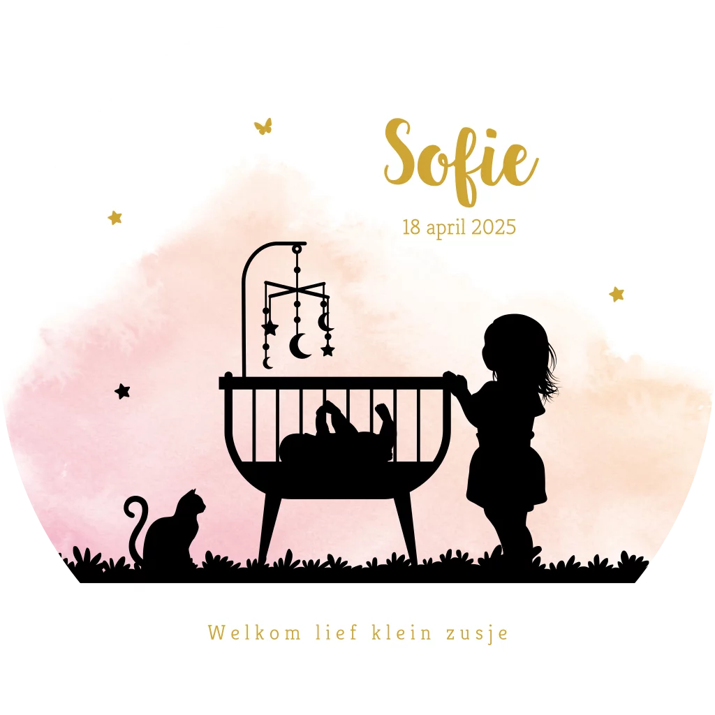 Hip roze watercolor geboortekaartje voor een meisje met silhouet van een grote zus met haar zusje in een wiegje. Personaliseer de kaart zelf met de afbeeldingen naar jouw eigen gezinssituatie. Andere silhouetjes zijn te vinden in de afbeeldingen bibliotheek in de editor. Dit kaartje is gestanst in een ronde vorm.