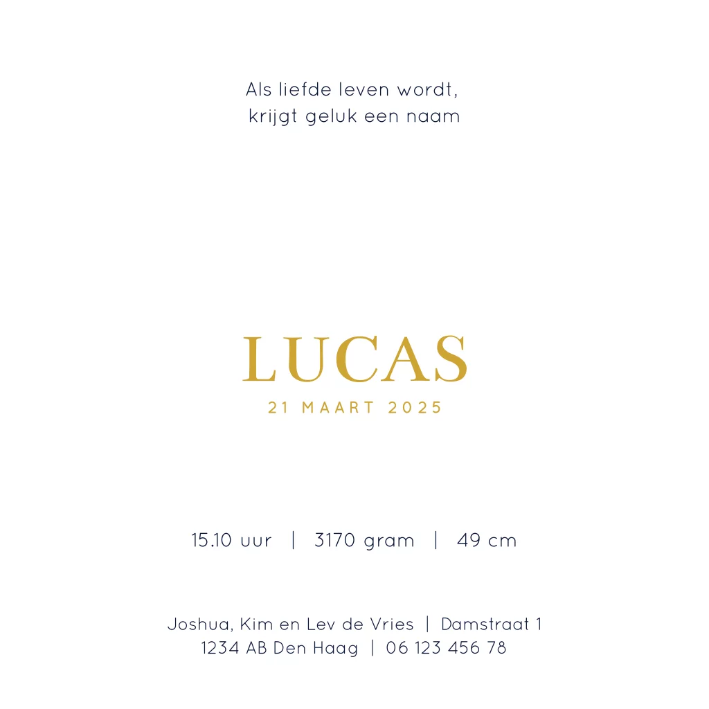 Geboortekaartje jongen stans vorm hartje en goudfolie