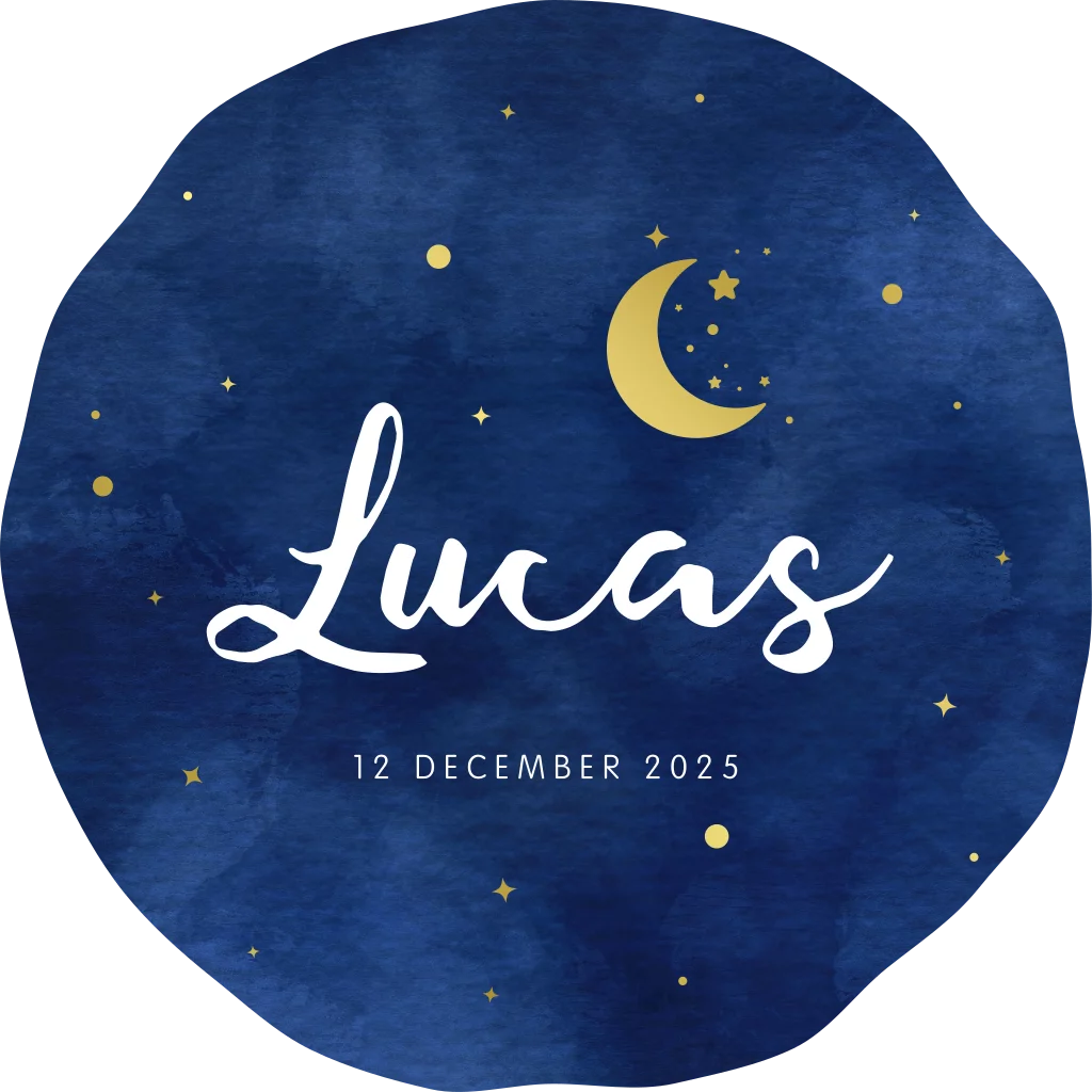 Enkel geboortekaartje met goudfolie maan en sterren. Deze kaart is gestanst in een organisch gevormde cirkel.