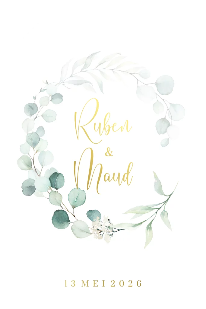 Trouwkaart botanisch in boogvorm met goudfolie.