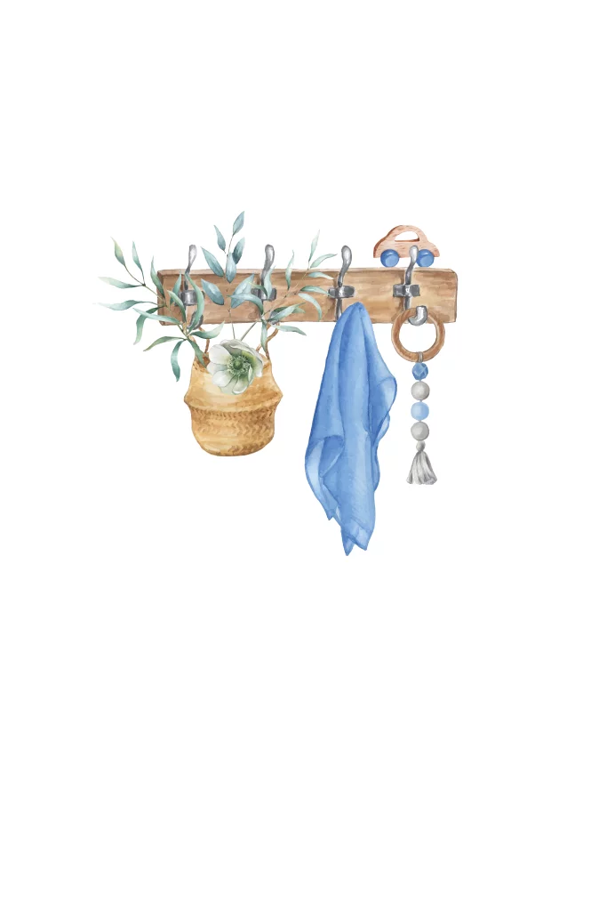 Geboortekaartje tekening met kapstokje, baby spulletjes en goudfolie