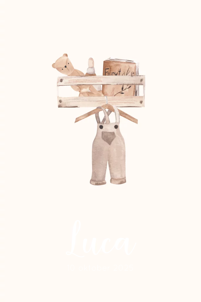 Geboortekaartje tekening van babypakje aan plankje en goudfolie