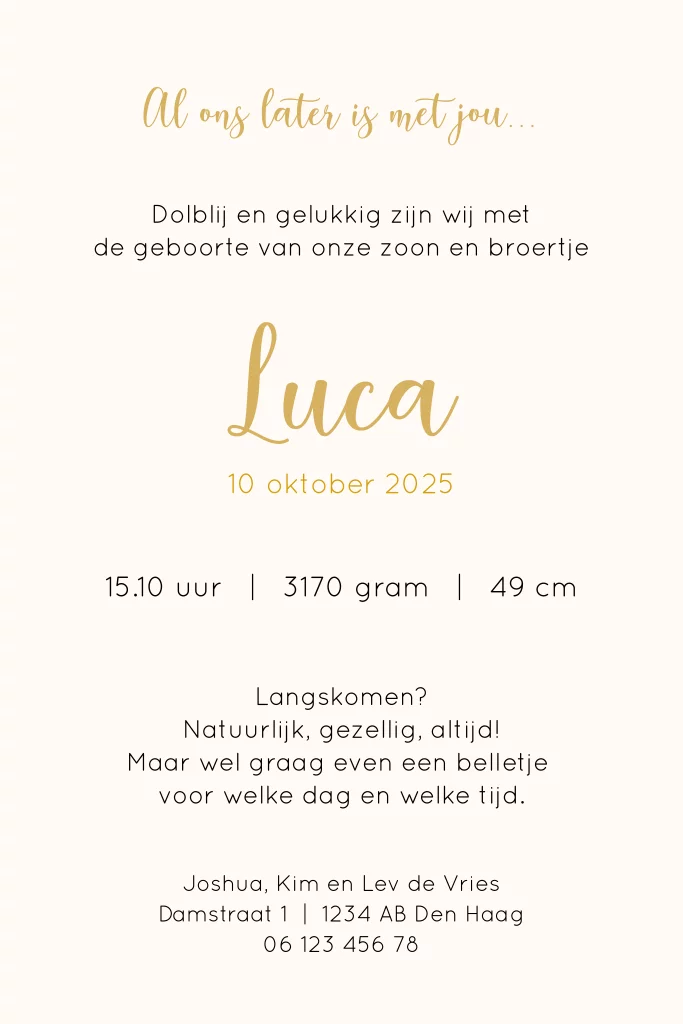 Geboortekaartje tekening van babypakje aan plankje en goudfolie. Liever toch koper- of zilverfolie? Je kunt dit gemakkelijk zelf aanpassen door op de naam te klikken en bij kleur de folie te kiezen die je wilt. Let op: Deze kaart heeft een langere verzendtijd: voor 18.00 uur besteld = de volgende werkdag gedrukt en verzonden. Minimale bestelhoeveelheid: 5 stuks.