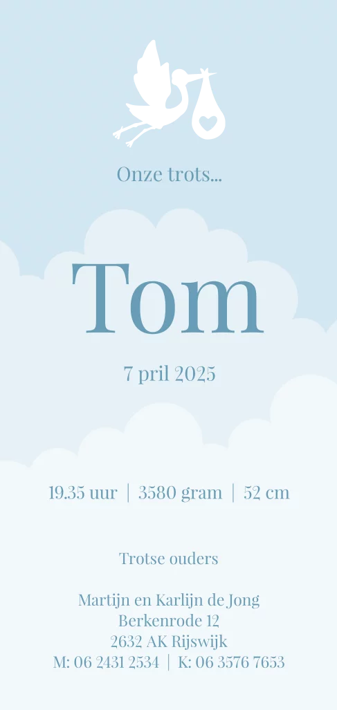 Langwerpig enkel geboortekaartje met ooievaar in goudfolie voor een jongen.