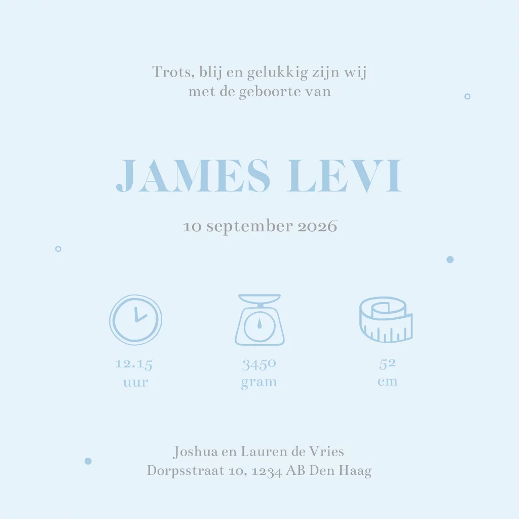 Lief geboortekaartje voor een jongen met echt blauw strikje en zilverfolie naam en stipjes. Het strikje wordt niet afgedrukt op de kaart maar is los bij te bestellen. Het afgebeelde kaartje is opgemaakt op het formaat 11x11cm. Het afgebeelde strikje is op dit formaat 1:1 weergegeven. Het strikje is voorzien van een plakkertje en zo dus gemakkelijk te bevestigen. Tevens zijn de kleuren van dit kaartje gemakkelijk aan te passen en zo creëer je weer een heel ander geboortekaartje! Let op: Deze kaart heeft een langere verzendtijd: voor 18.00 uur besteld = de volgende werkdag gedrukt en verzonden. Minimale bestelhoeveelheid: 5 stuks.