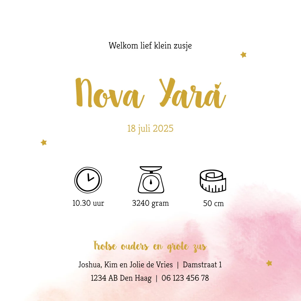 Hip roze watercolor geboortekaartje voor een meisje met silhouet van een grote zus met haar zusje in een wiegje. Personaliseer de kaart zelf met de afbeeldingen naar jouw eigen gezinssituatie. Andere silhouetjes zijn te vinden in de afbeeldingen bibliotheek in de editor. Liever toch koper- of zilverfolie? Je kunt dit gemakkelijk zelf aanpassen door op de naam te klikken en bij kleur de folie te kiezen die je wilt. Let op: Deze kaart heeft een langere verzendtijd: voor 18.00 uur besteld = de volgende werkdag gedrukt en verzonden. Minimale bestelhoeveelheid: 5 stuks.