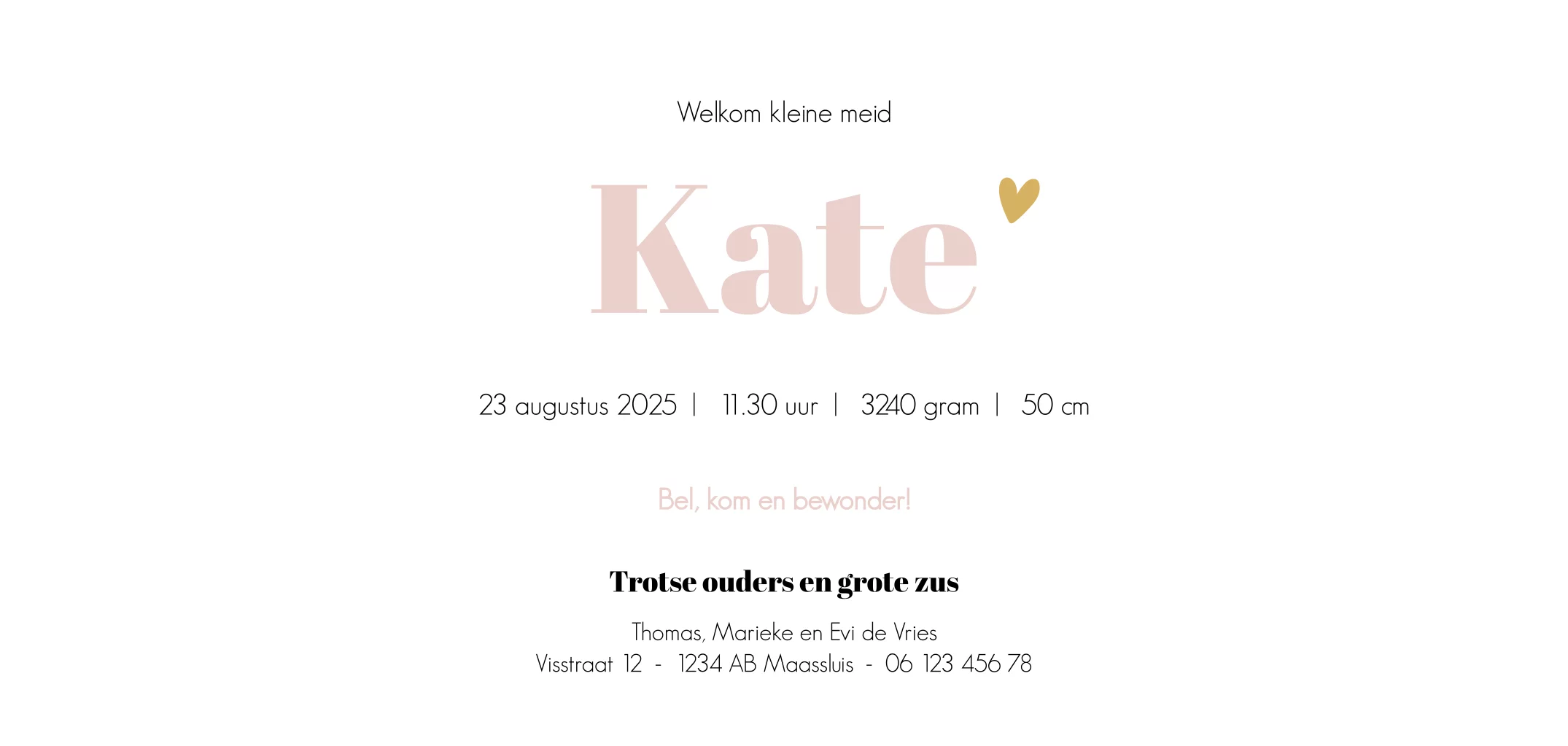 Geboortekaartje voor een meisje met de naam en het hartje in goudfolie. Liever toch koper- of zilverfolie? Je kunt dit gemakkelijk zelf aanpassen door op de naam te klikken en bij kleur de folie te kiezen die je wilt. Let op: Deze kaart heeft een langere verzendtijd: voor 18.00 uur besteld = de volgende werkdag gedrukt en verzonden. Minimale bestelhoeveelheid: 5 stuks.