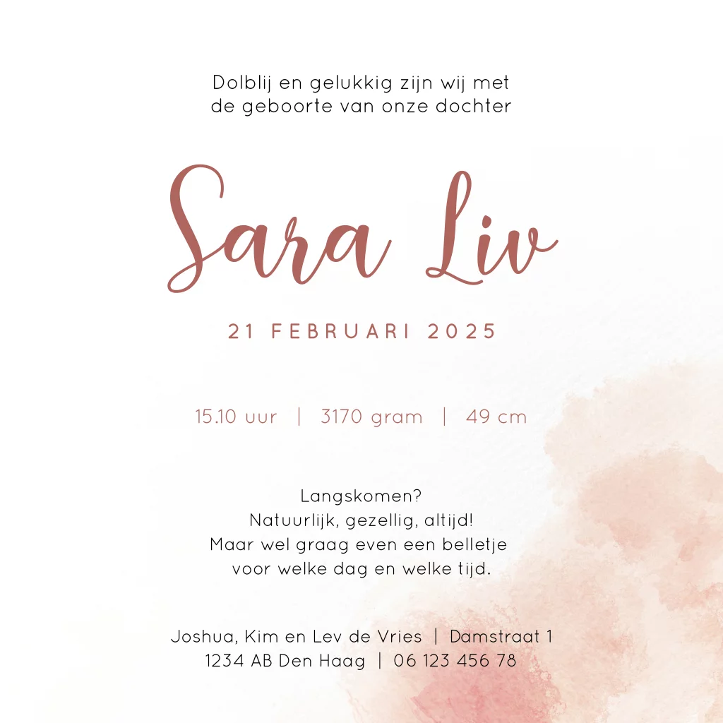 Geboortekaartje in terracotta met goudfolie naam en elementjes. Liever toch koper- of zilverfolie? Je kunt dit gemakkelijk zelf aanpassen door op de naam te klikken en bij kleur de folie te kiezen die je wilt. Let op: Deze kaart heeft een langere verzendtijd: voor 18.00 uur besteld = de volgende werkdag gedrukt en verzonden. Minimale bestelhoeveelheid: 5 stuks.