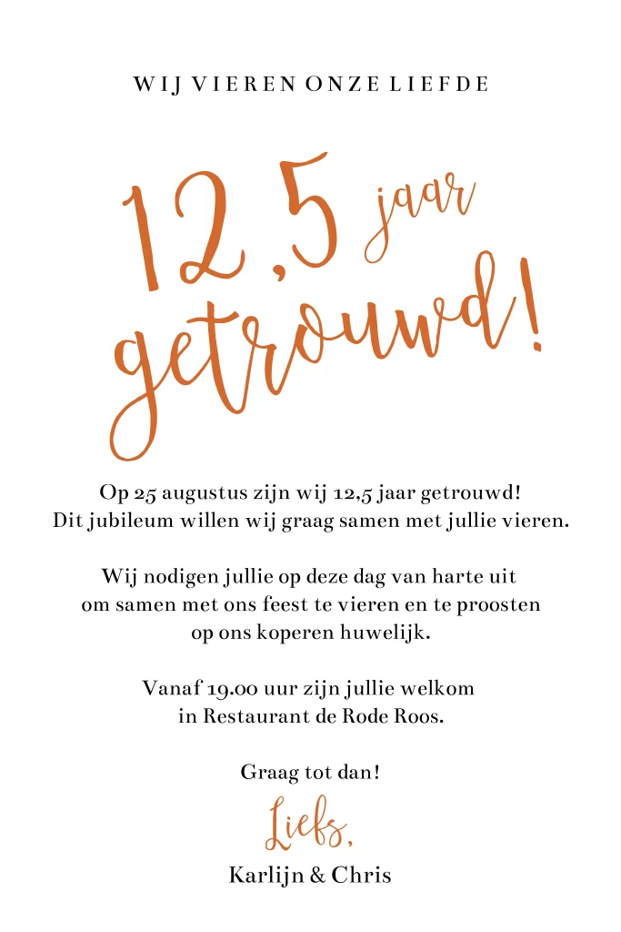 Jubileumkaart uitnodiging clean 12,5 jaar getrouwd met folie. Liever toch een andere kleur folie? Je kunt dit gemakkelijk zelf aanpassen door op de naam te klikken en bij kleur de folie te kiezen die je wilt. Let op: Deze kaart heeft een langere verzendtijd: voor 18.00 uur besteld = de volgende werkdag gedrukt en verzonden. Minimale bestelhoeveelheid: 5 stuks.