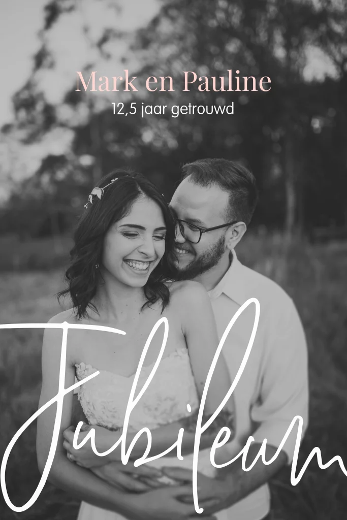 Gefeliciteerd! Jullie zijn 12,5 jaar getrouwd. Maak deze jubileumkaart helemaal eigen en voeg een afbeelding van jullie toe. De tekst kunnen jullie eenvoudig personaliseren in onze editor! Ergens hulp bij nodig? Laat het ons dan weten! We kijken graag even met jullie mee.