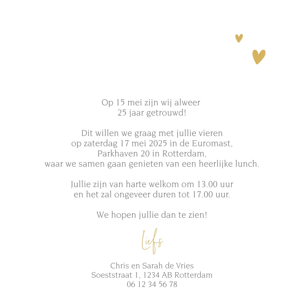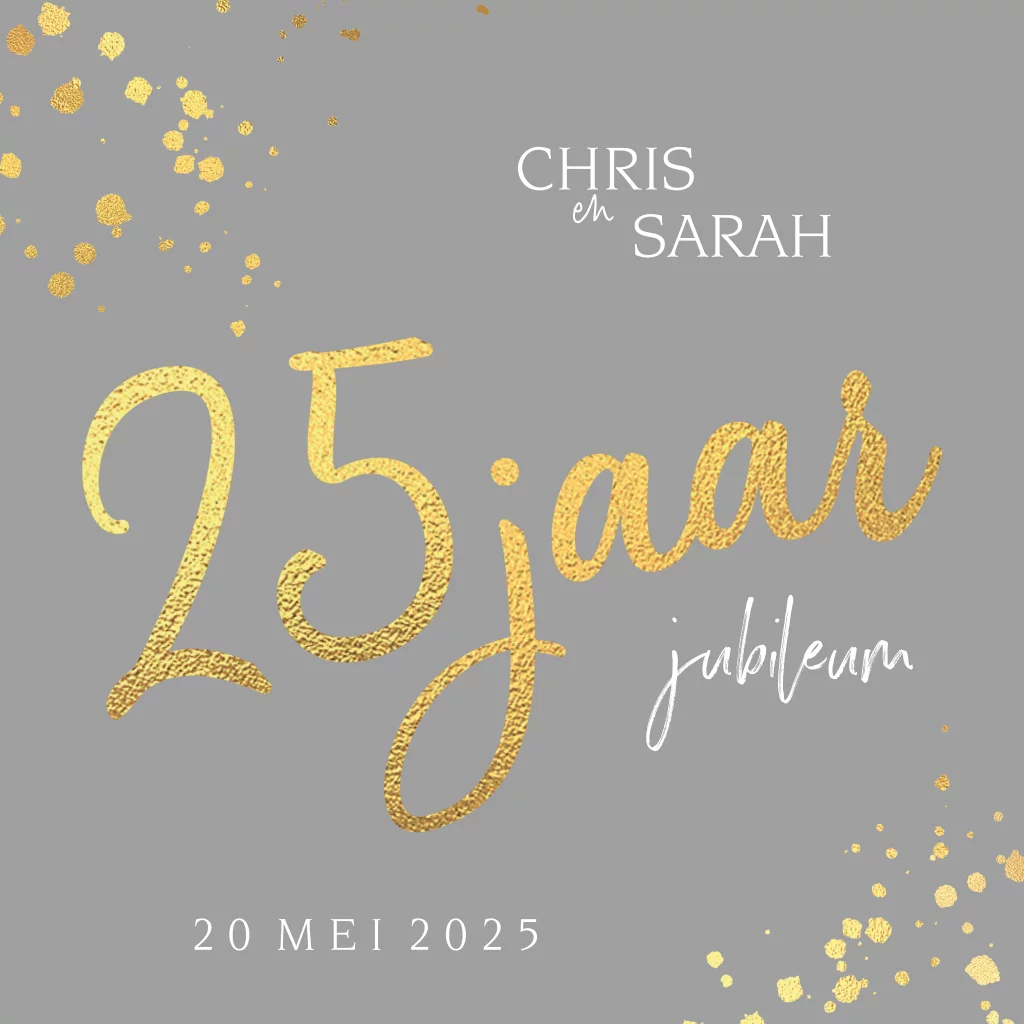Jubileumkaart grijs 25 jaar getrouwd met goudfolie look. De achtergrondkleur is gemakkelijk naar wens aan te passen.