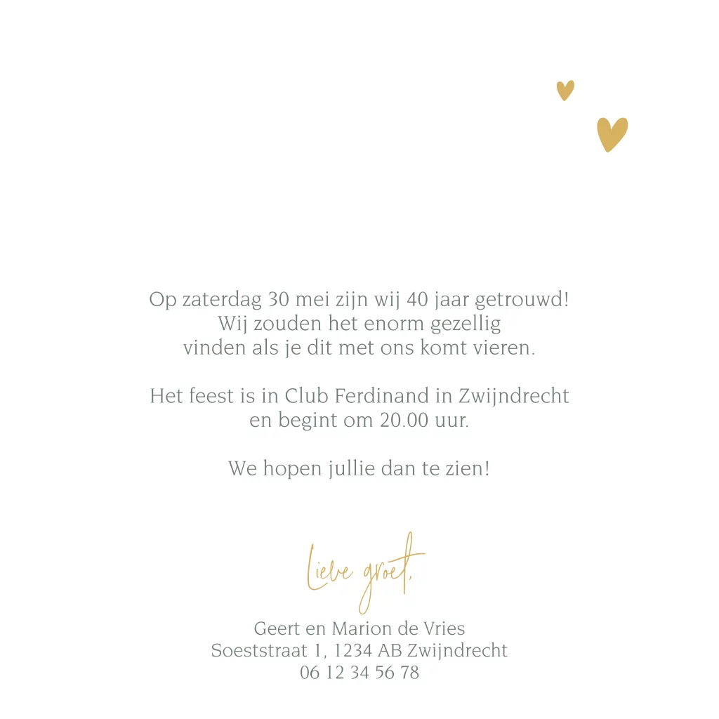Jubileumkaart groen 40 jaar getrouwd met goudfolie look. De achtergrondkleur is gemakkelijk naar wens aan te passen.