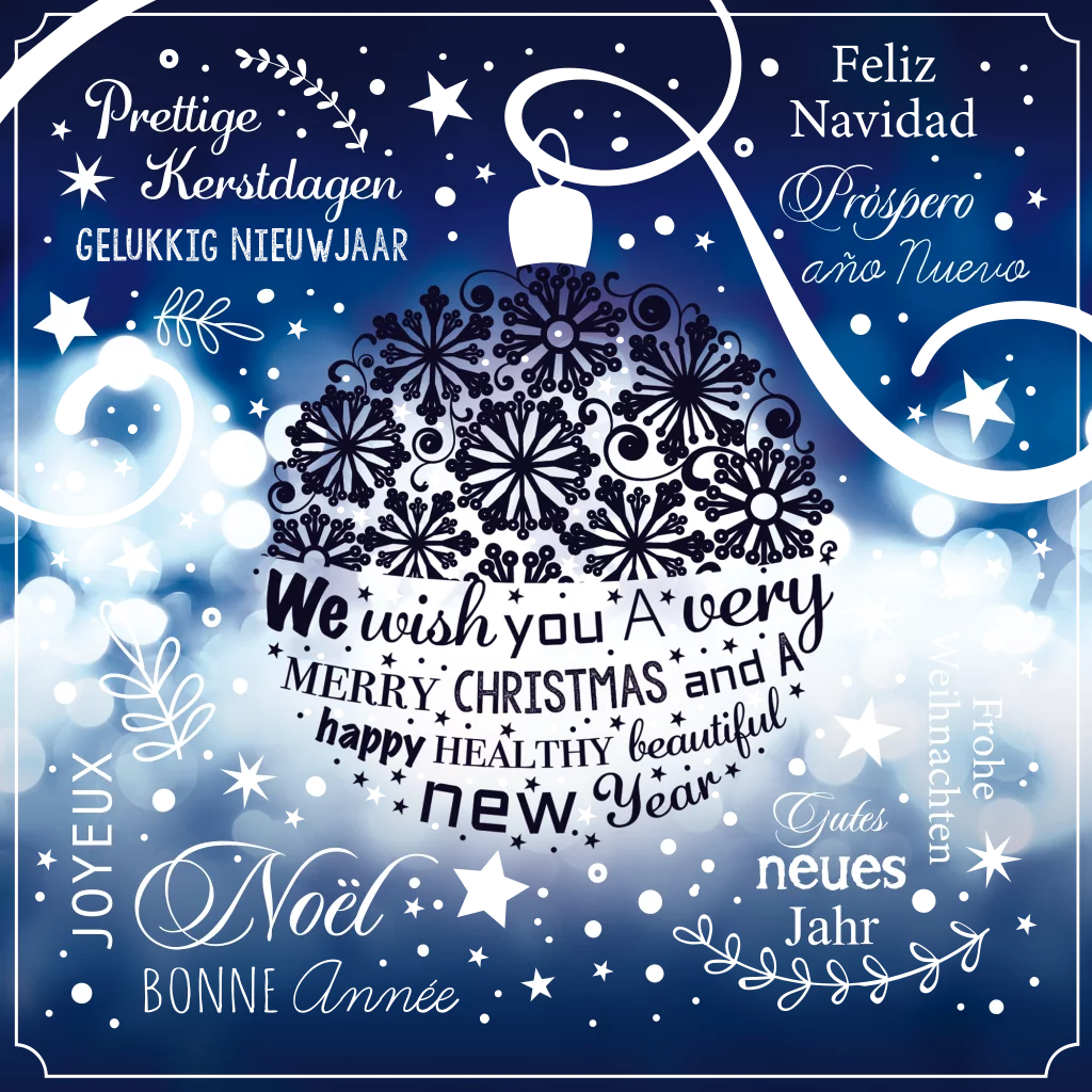 Blauwe kerstkaart met kerstbal, tekst en zilverfolie. Liever toch een andere kleur folie? Je kunt dit gemakkelijk zelf aanpassen door bij kleur de folie te kiezen die je wilt. Let op: Deze kaart heeft een langere verzendtijd: voor 18.00 uur besteld = de volgende werkdag gedrukt en verzonden. Minimale bestelhoeveelheid: 5 stuks.